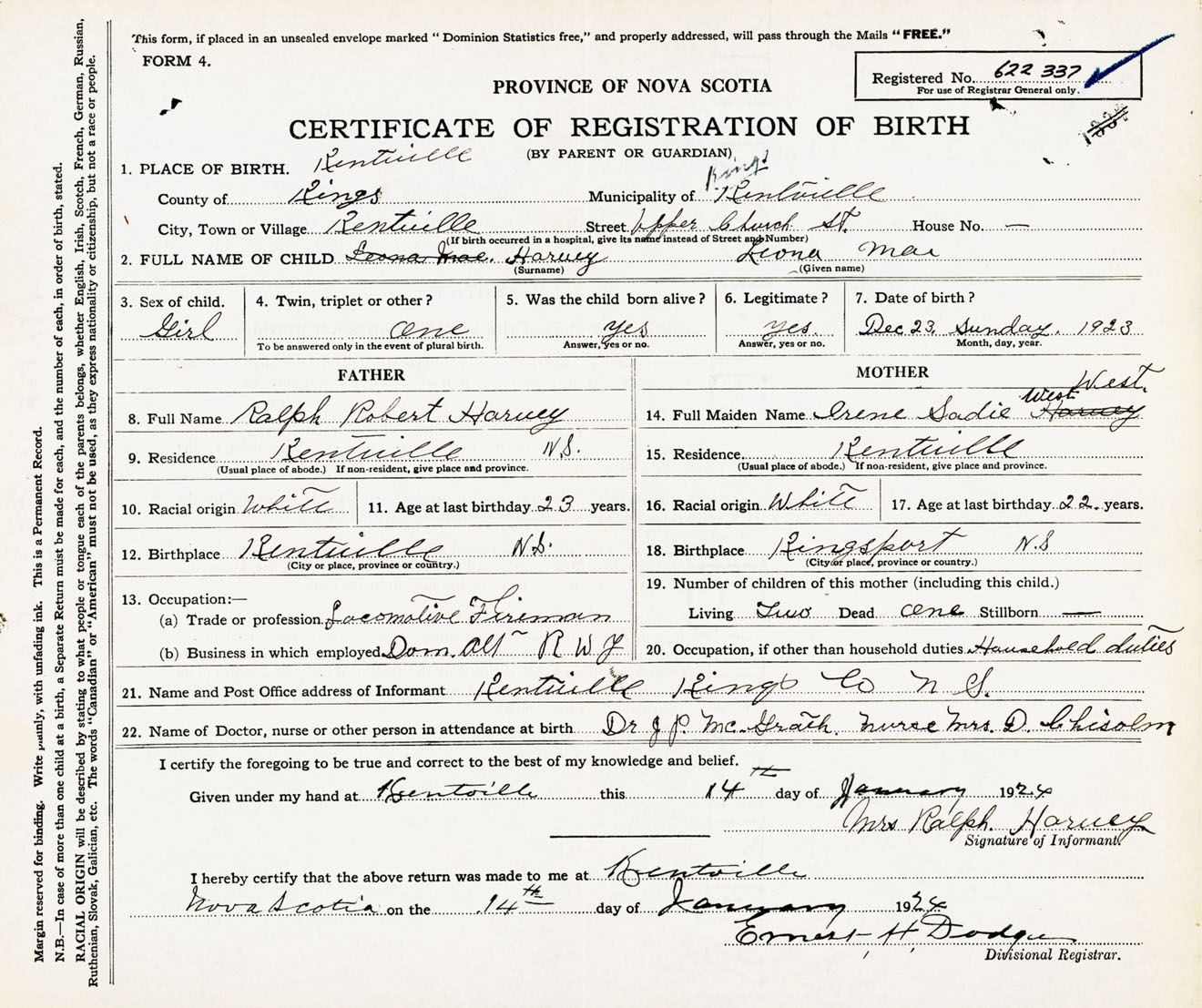 Female Birth Registration: Year: 1923 number: 62200337