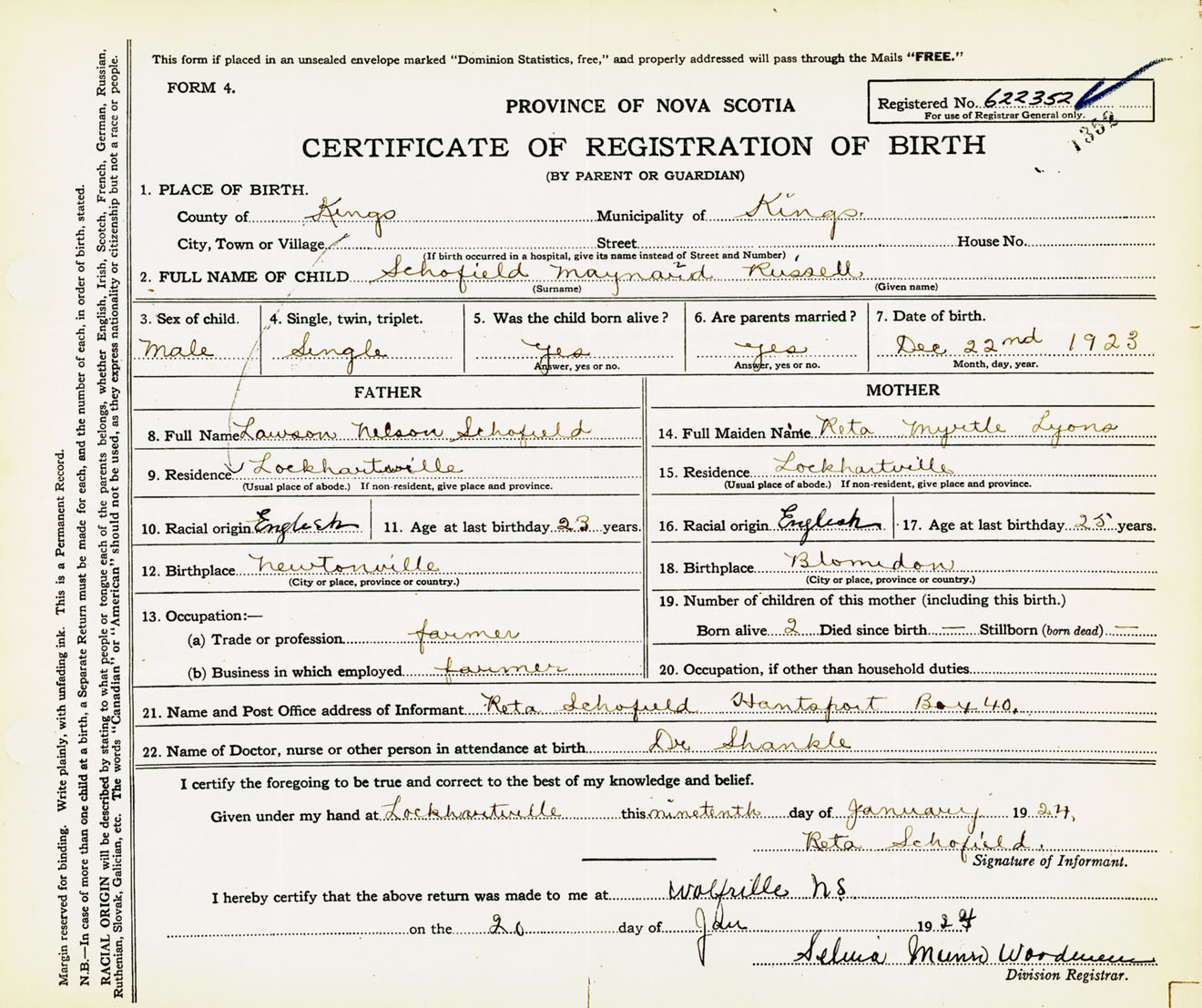 Male Birth Registration: Year: 1923 number: 62200352