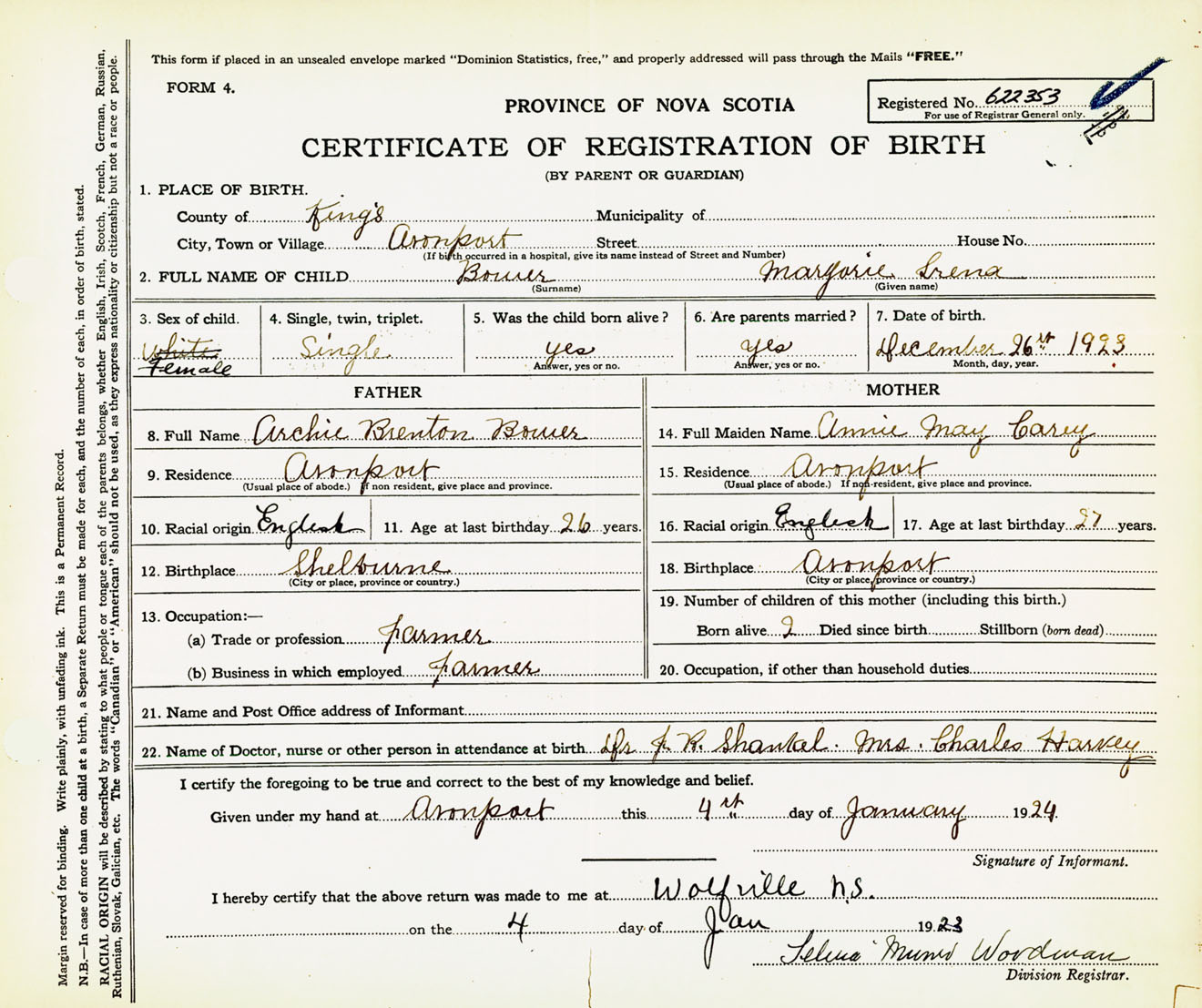 Female Birth Registration: Year: 1923 number: 62200353