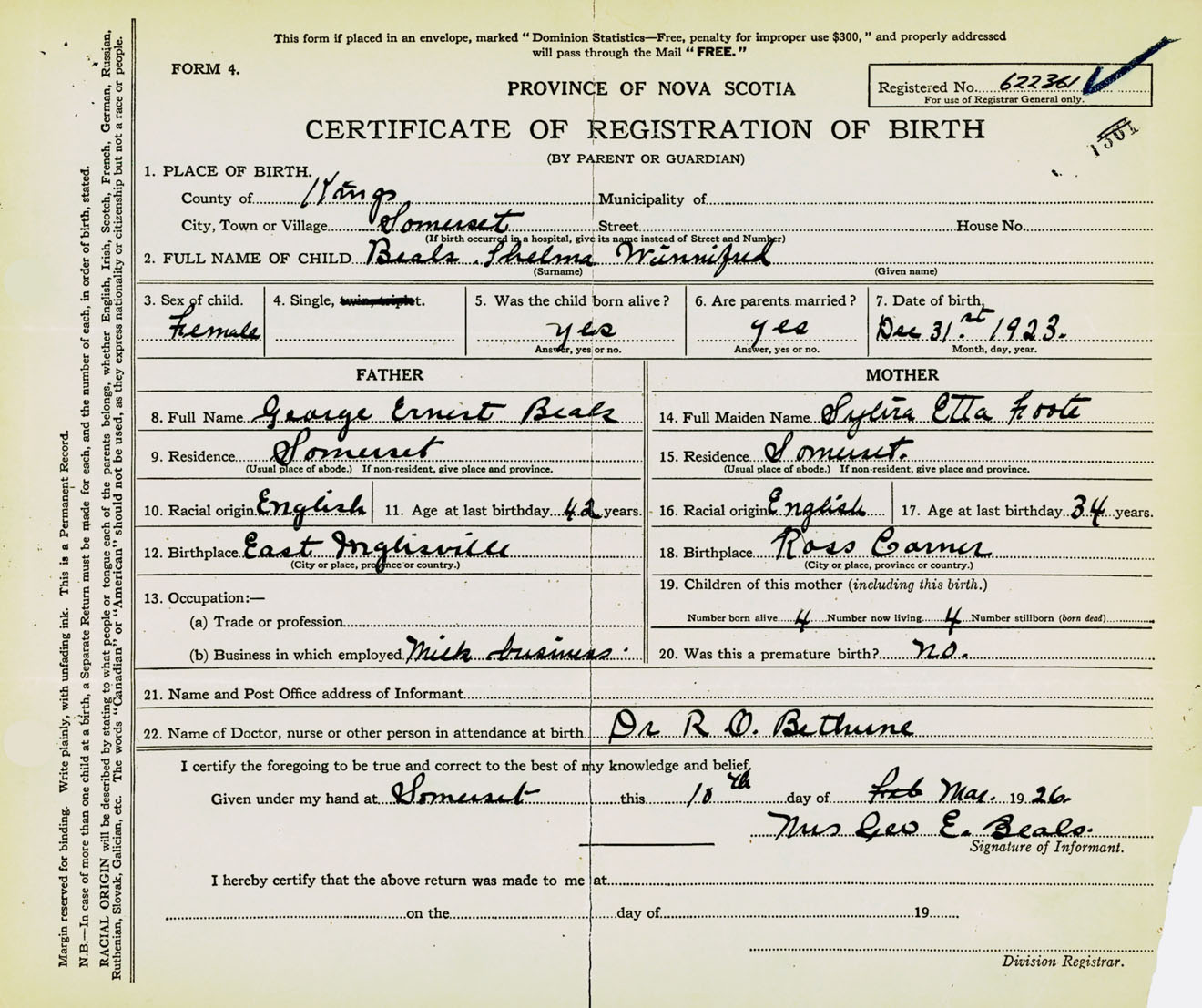 Female Birth Registration: Year: 1923 number: 62200361