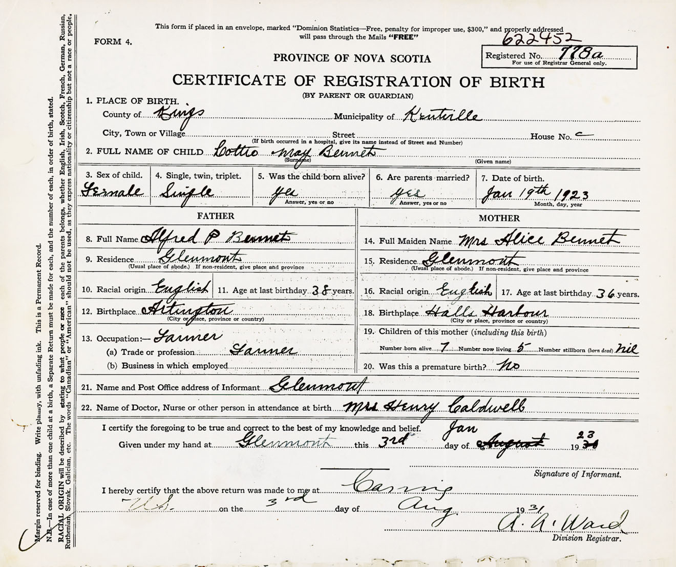 Female Birth Registration: Year: 1923 number: 62200452
