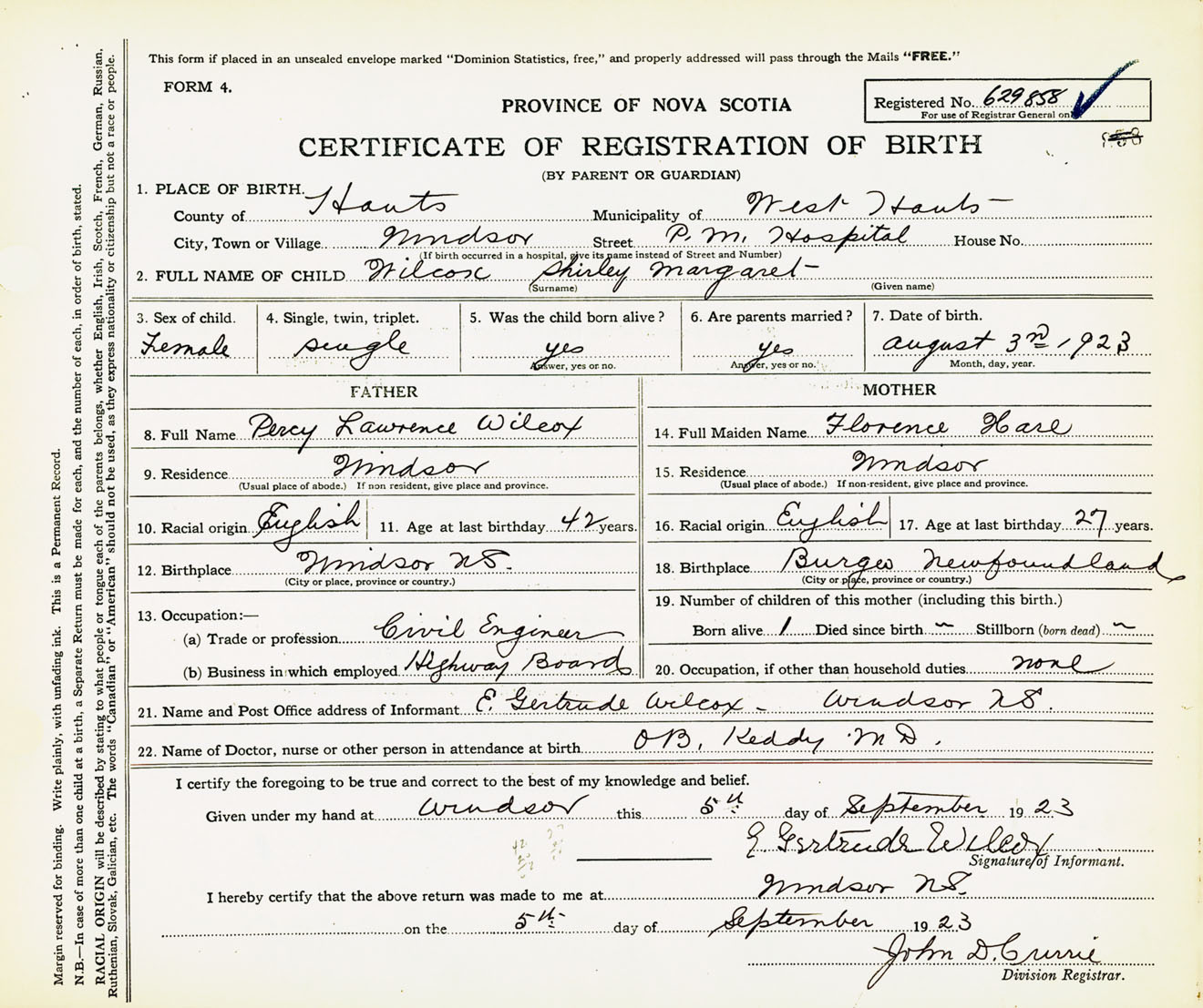 Female Birth Registration: Year: 1923 number: 62900858