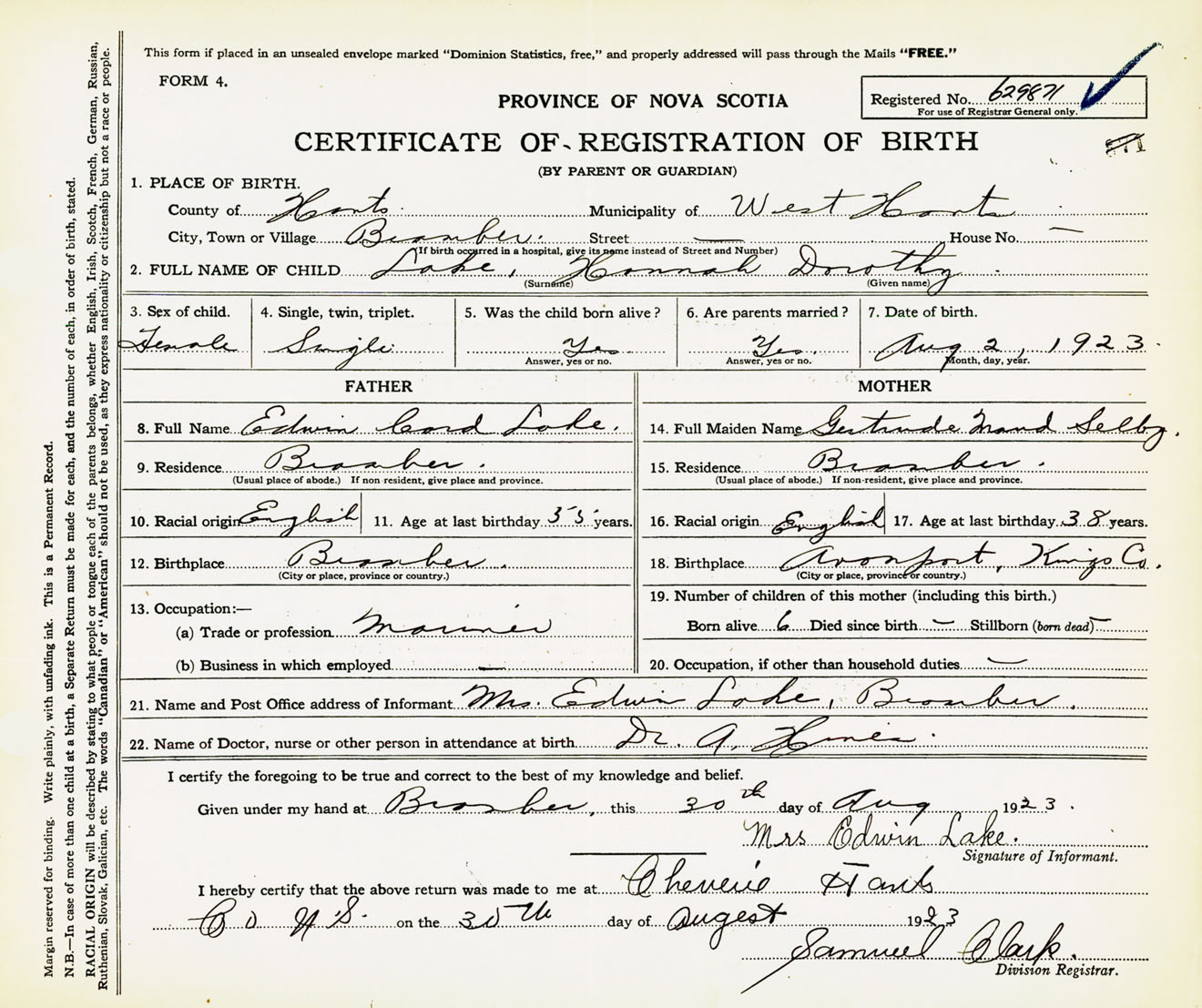 Female Birth Registration: Year: 1923 number: 62900871