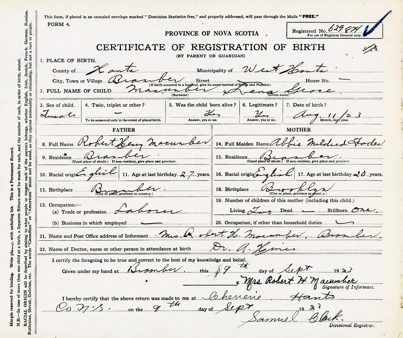 Female Birth Registration: Year: 1923 number: 62900874