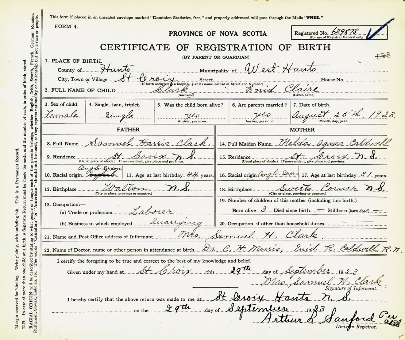 22. Name of Doctor, nurse or other person in attendance at birth Dr. C.H. Morris, Enid R. Caldwell R.N.