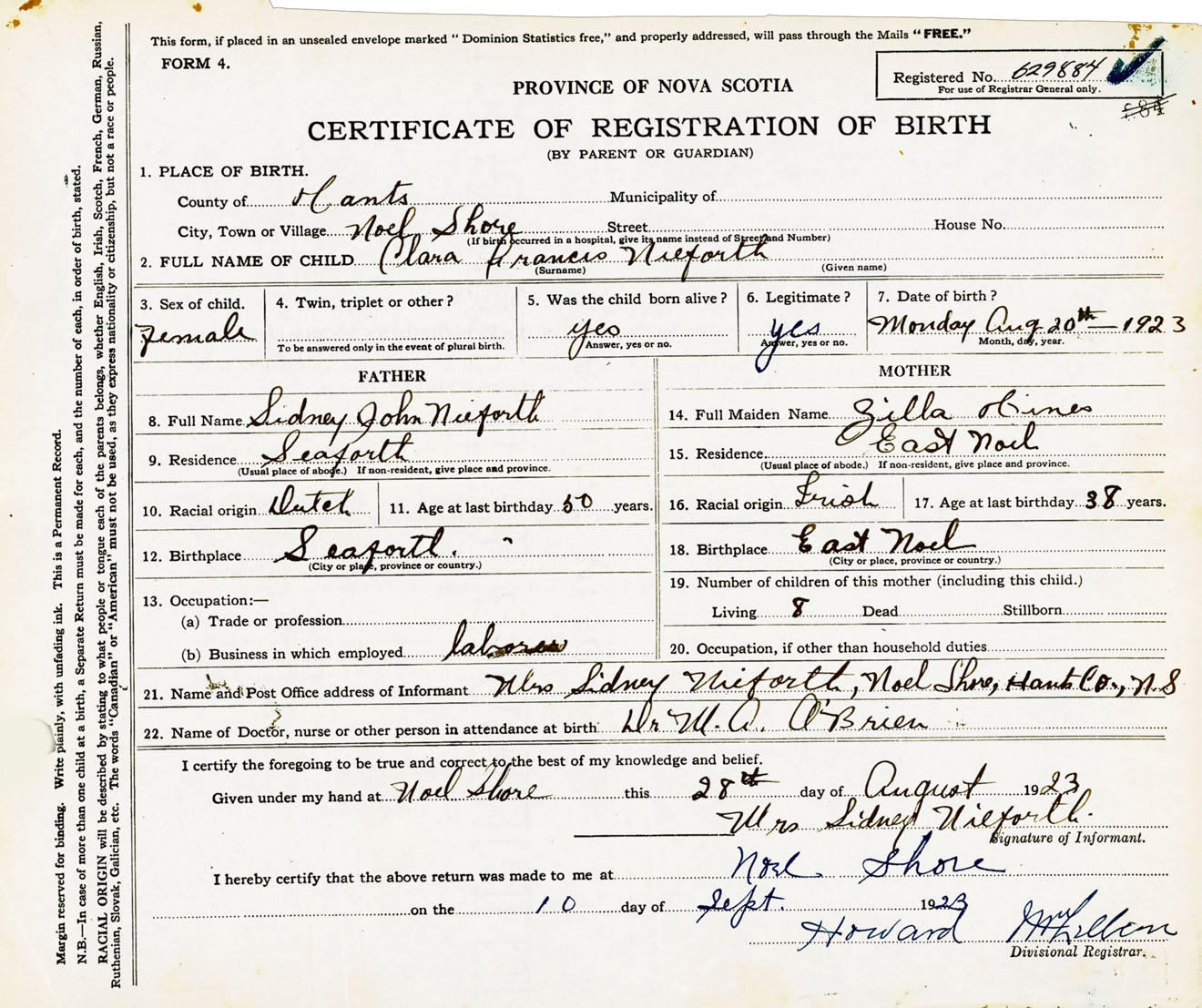 22. Name of Doctor, nurse or other person in attendance at birth Dr. M.A. O'Brien