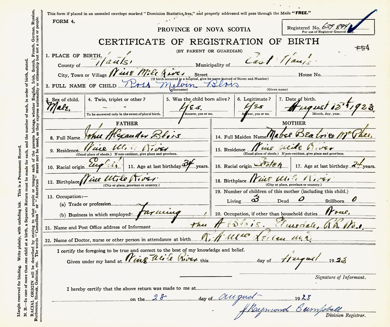 22. Name of Doctor, nurse or other person in attendance at birth R.A. MacLellan, M.D.