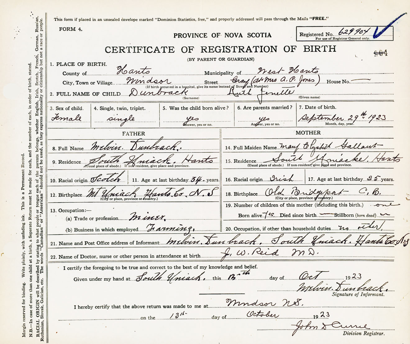 22. Name of Doctor, nurse or other person in attendance at birth J.W. Reid M.D.