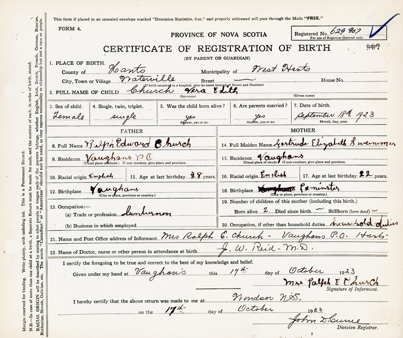 22. Name of Doctor, nurse or other person in attendance at birth J.W. Reid M.D.
