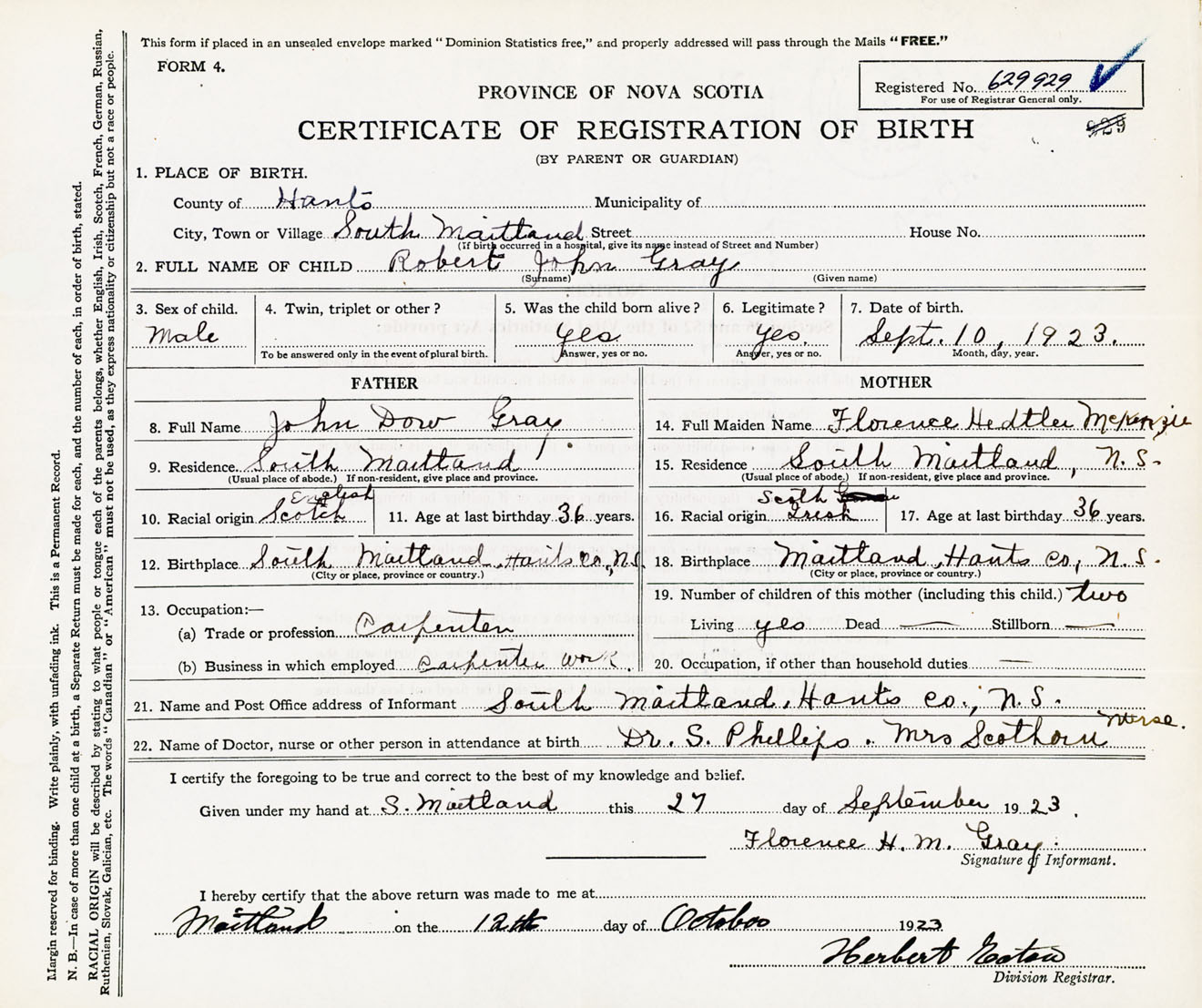 22. Name of Doctor, nurse or other person in attendance at birth Dr. S. Phillips, Mrs. Scothorn nurse