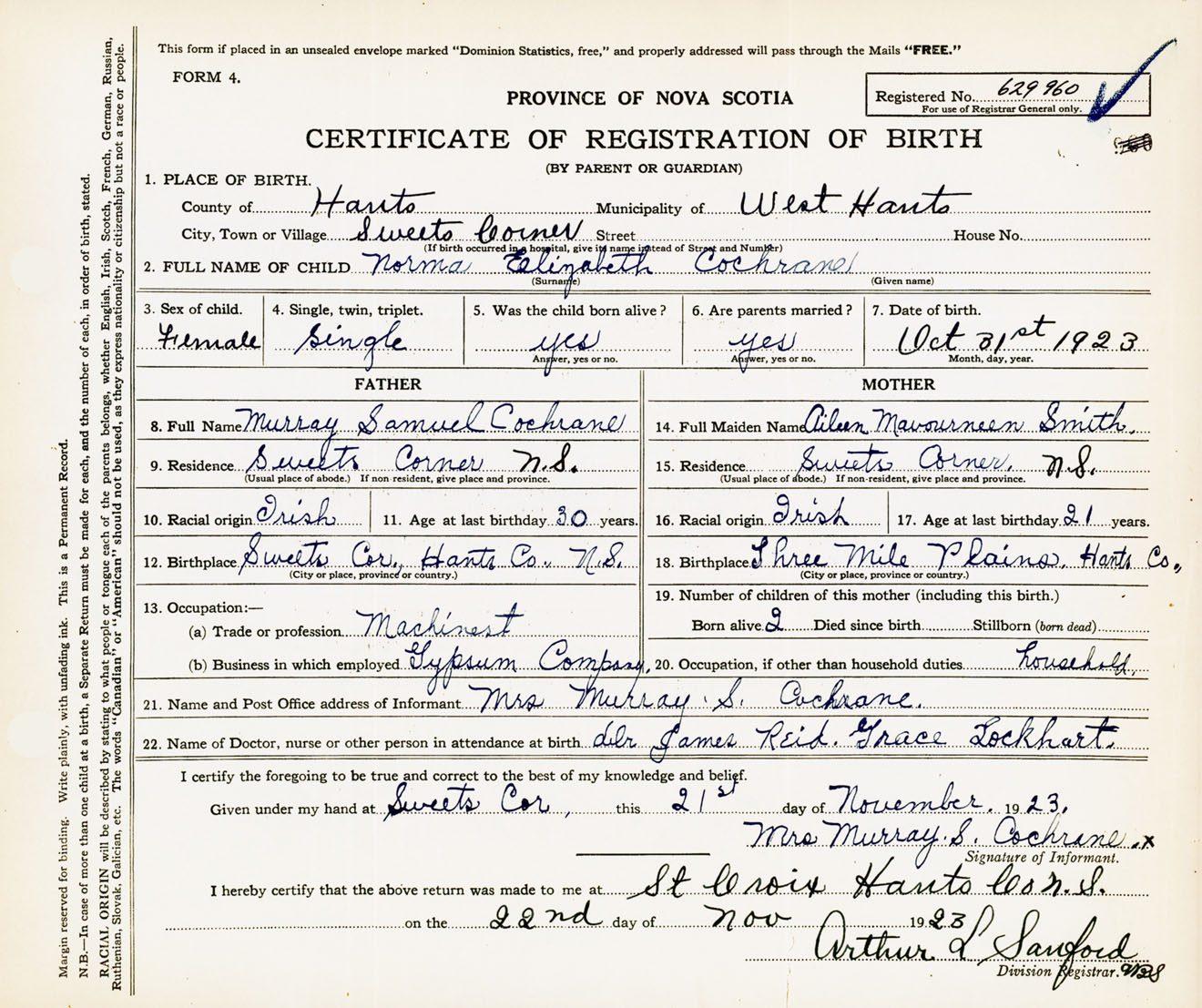 22. Name of Doctor, nurse or other person in attendance at birth Dr. James Reid, Grace Lockhart