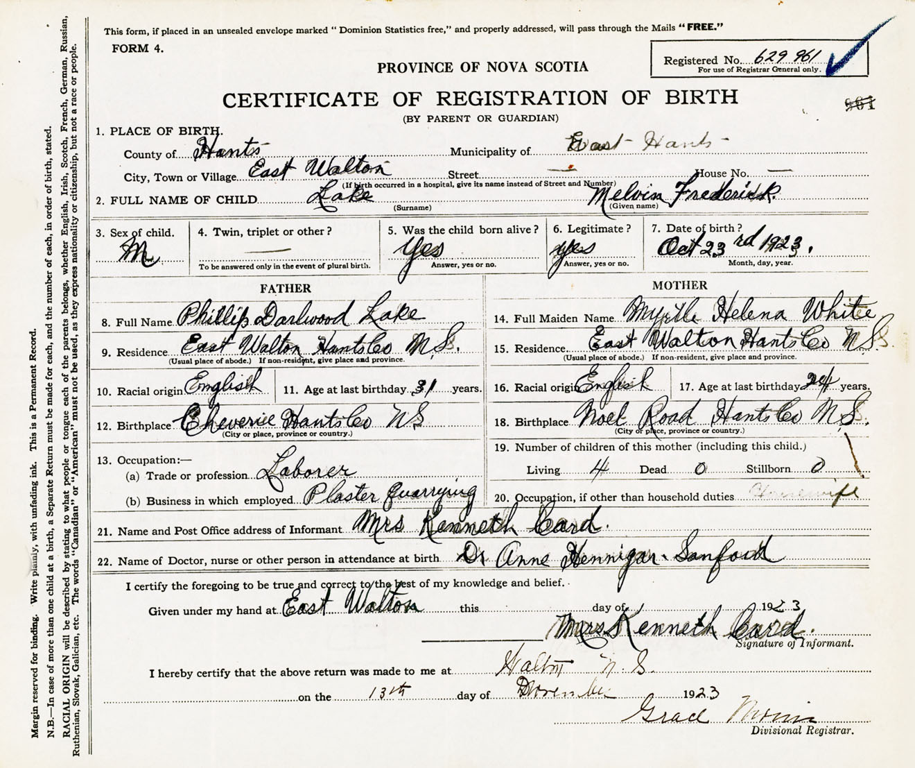 Male Birth Registration: Year: 1923 number: 62900961