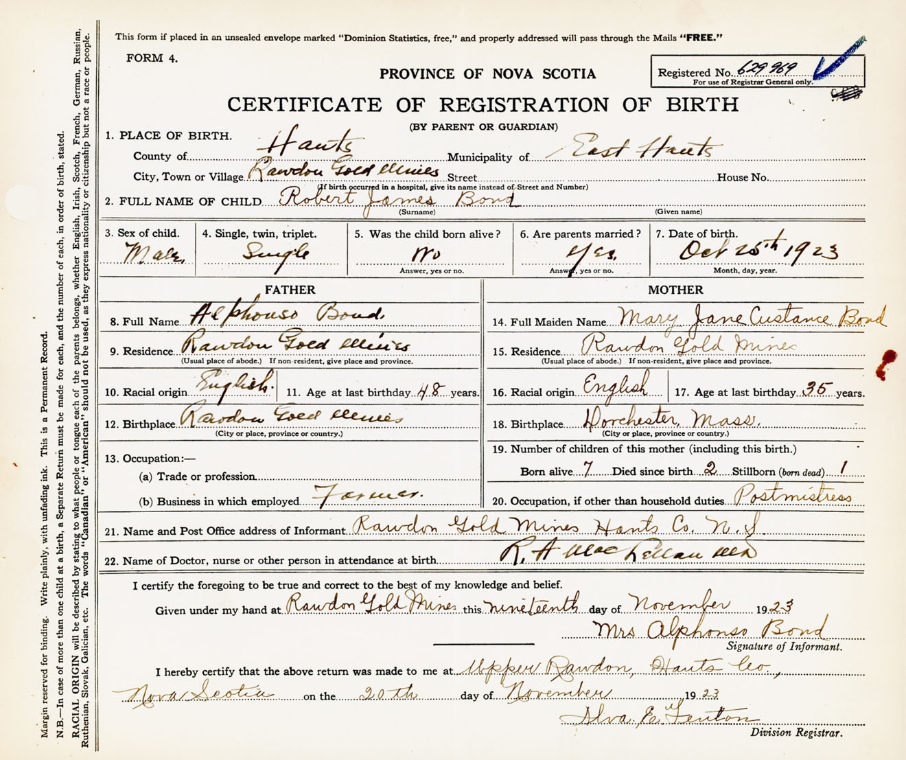 21. Name and Post Office address of Informant Mrs. Alphonso Bond Rawdon Gold Mines