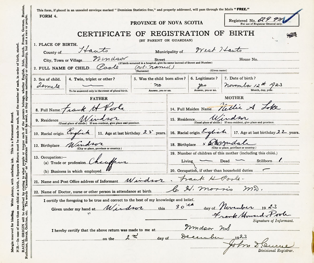22. Name of Doctor, nurse or other person in attendance at birth C.H. Morris M.D.