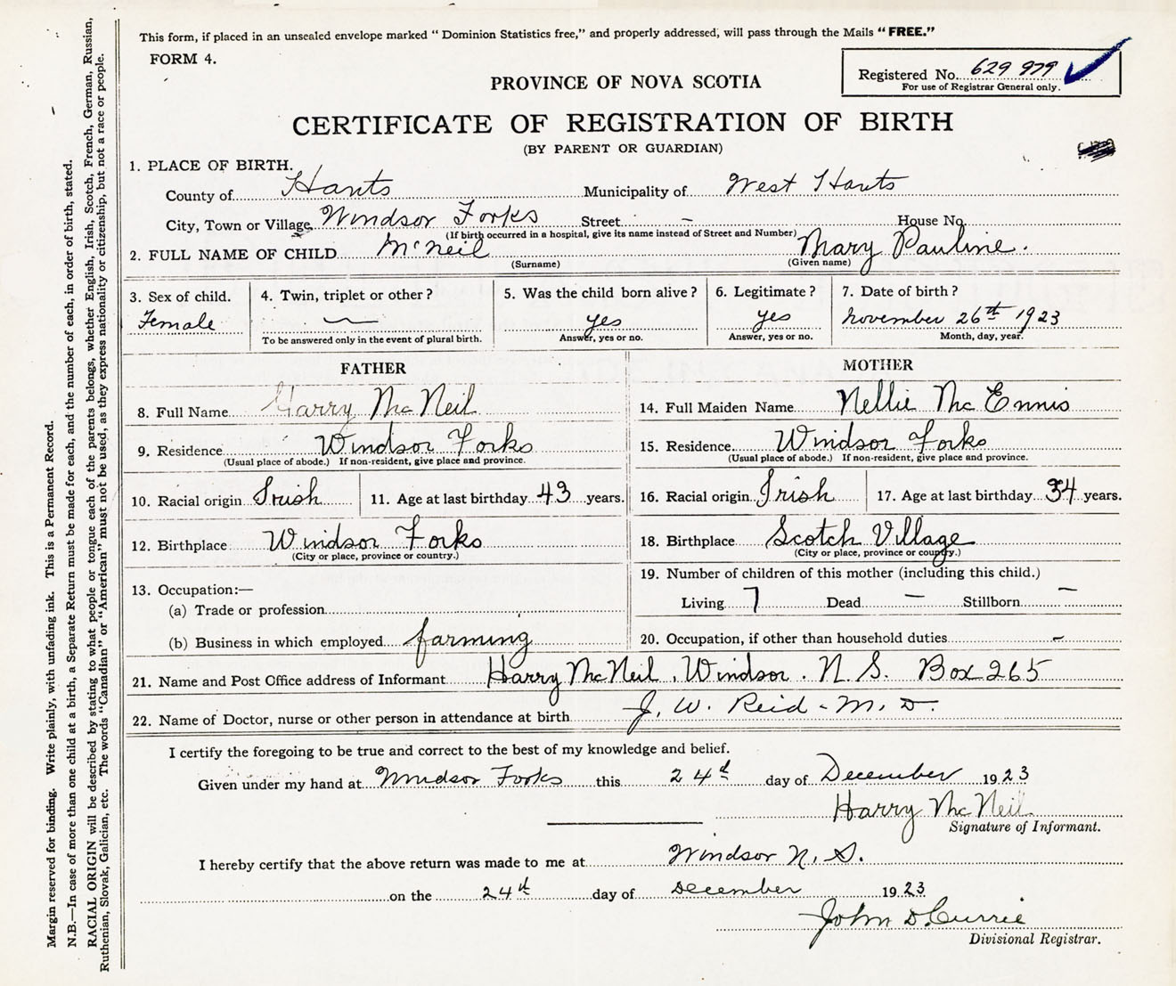 22. Name of Doctor, nurse or other person in attendance at birth J.W. Reid M.D.