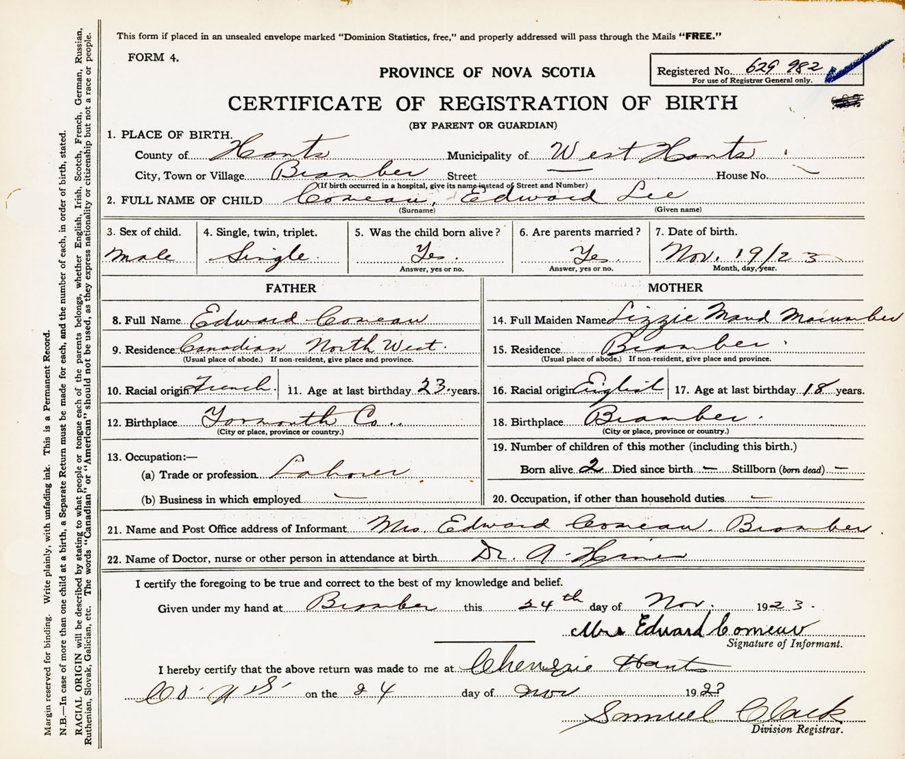 Male Birth Registration: Year: 1923 number: 62900982