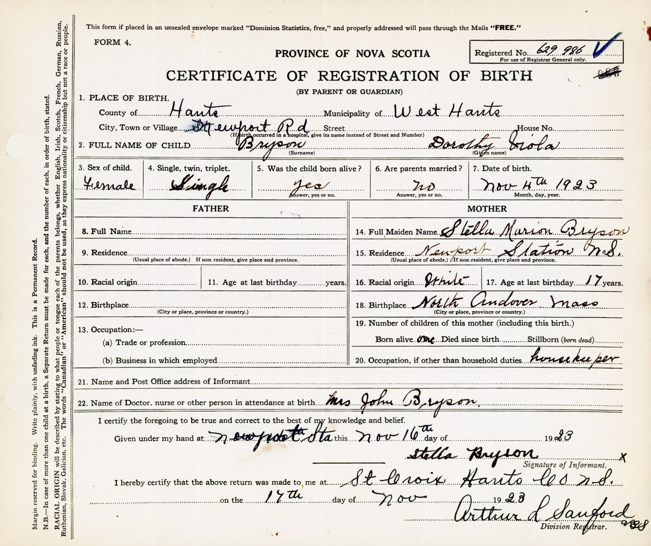 22. Name of Doctor, nurse or other person in attendance at birth Mrs. John Bryson