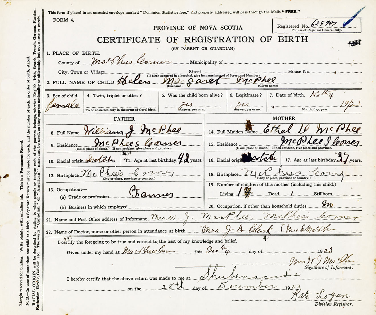 22. Name of Doctor, nurse or other person in attendance at birth Mrs. J.A. Clark Mrs. E. MacPhee