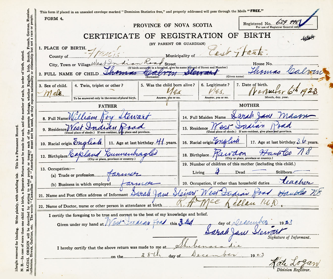 22. Name of Doctor, nurse or other person in attendance at birth R.A. MacLellan M.D.