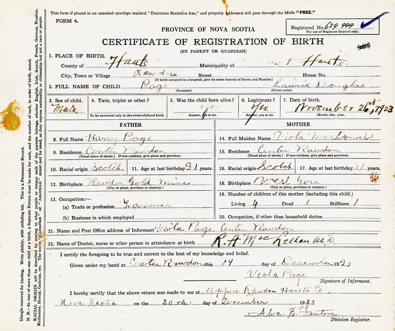 22. Name of Doctor, nurse or other person in attendance at birth R.A. MacLellan M.D.