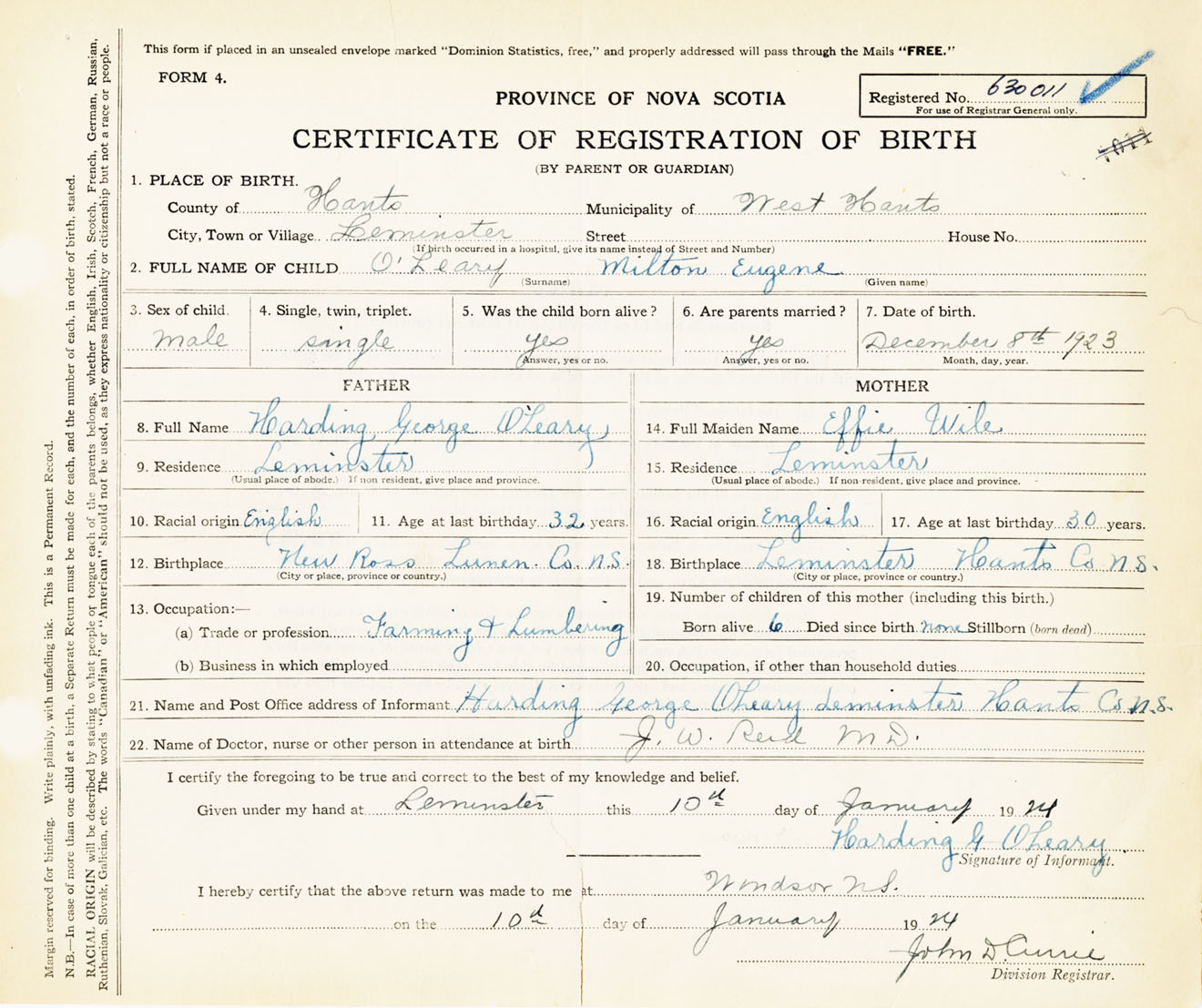 Male Birth Registration: Year: 1923 number: 63000011