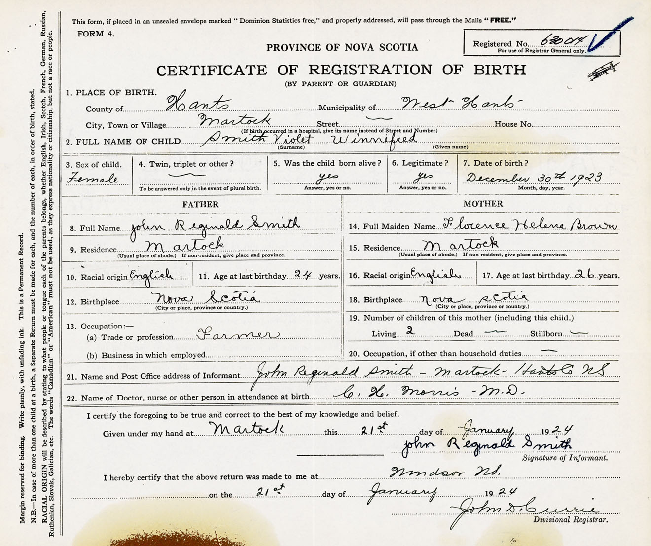 22. Name of Doctor, nurse or other person in attendance at birth C.H. Morris M.D.