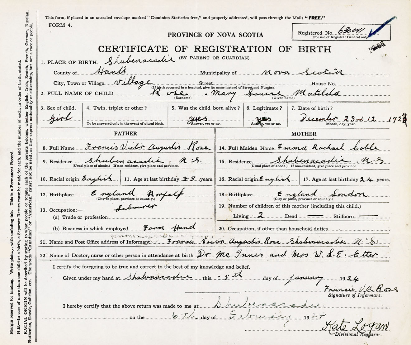 22. Name of Doctor, nurse or other person in attendance at birth Dr. McInnis and Mrs. W.L.E. Etter