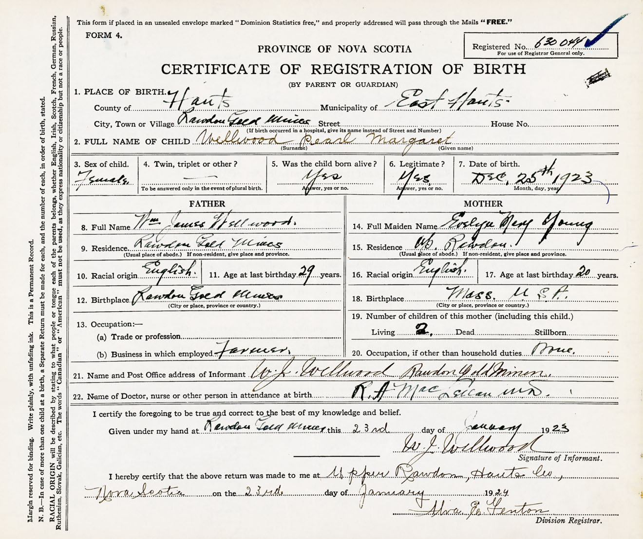 22. Name of Doctor, nurse or other person in attendance at birth R.A. MacLellan M.D.