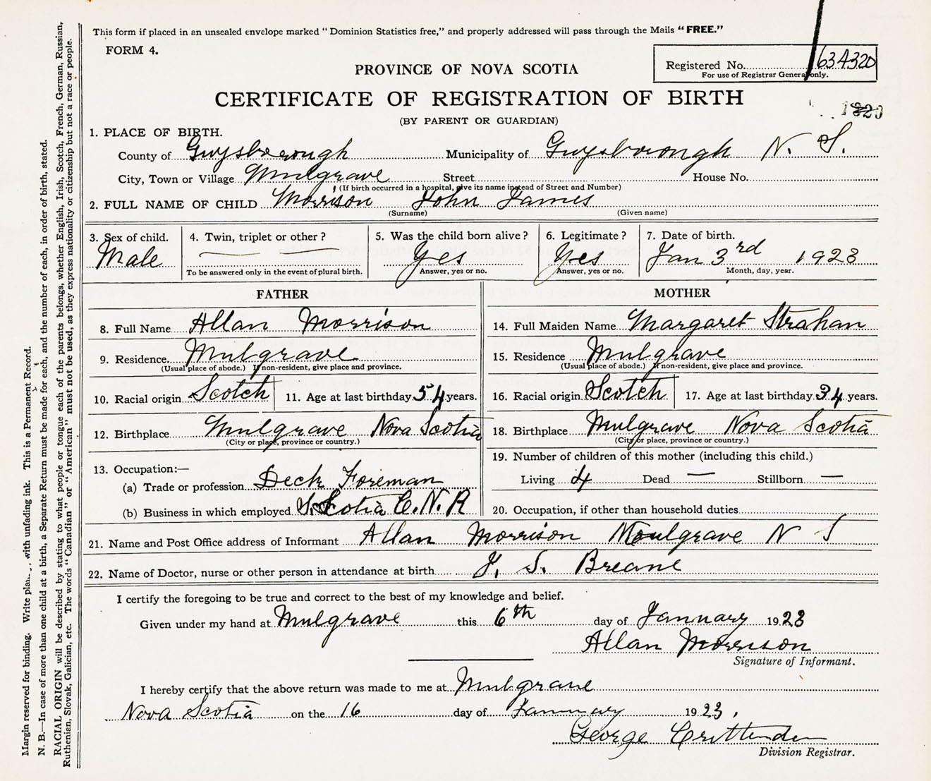 Male Birth Registration: Year: 1923 number: 63400320