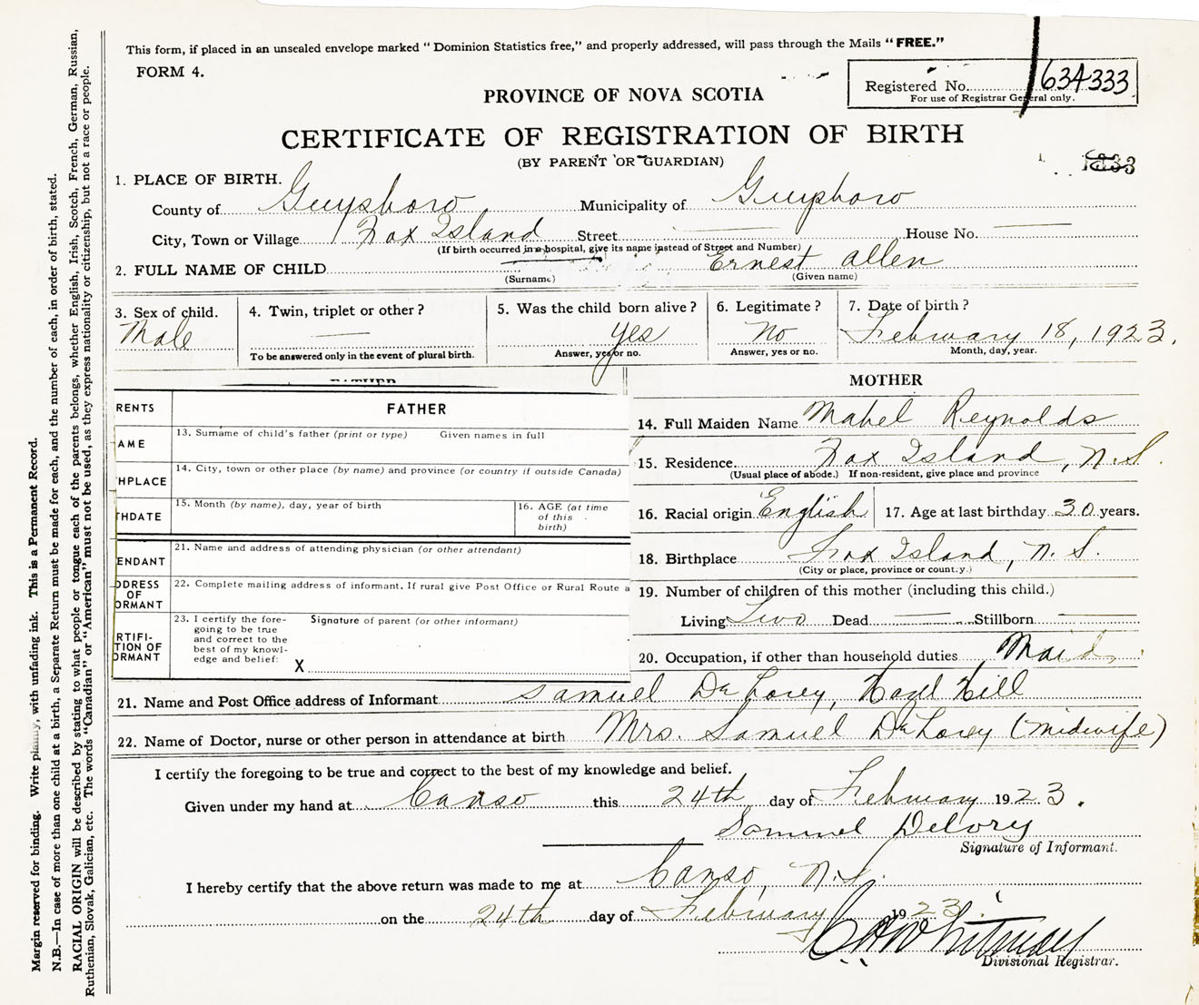 Male Birth Registration: Year: 1923 number: 63400333