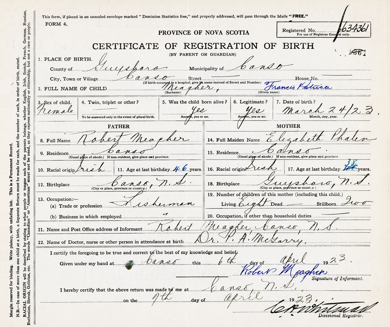 Female Birth Registration: Year: 1923 number: 63400361