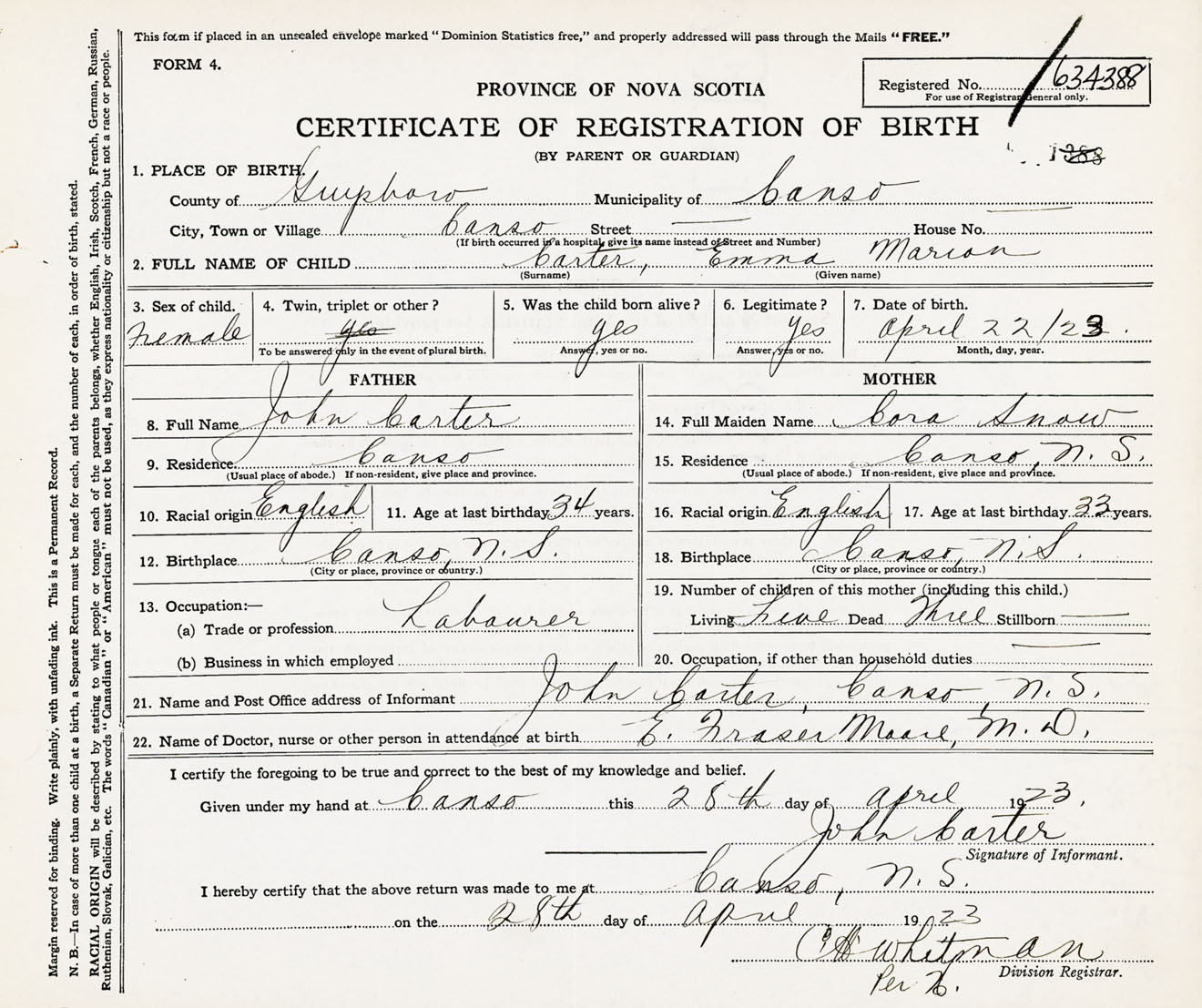 Female Birth Registration: Year: 1923 number: 63400388