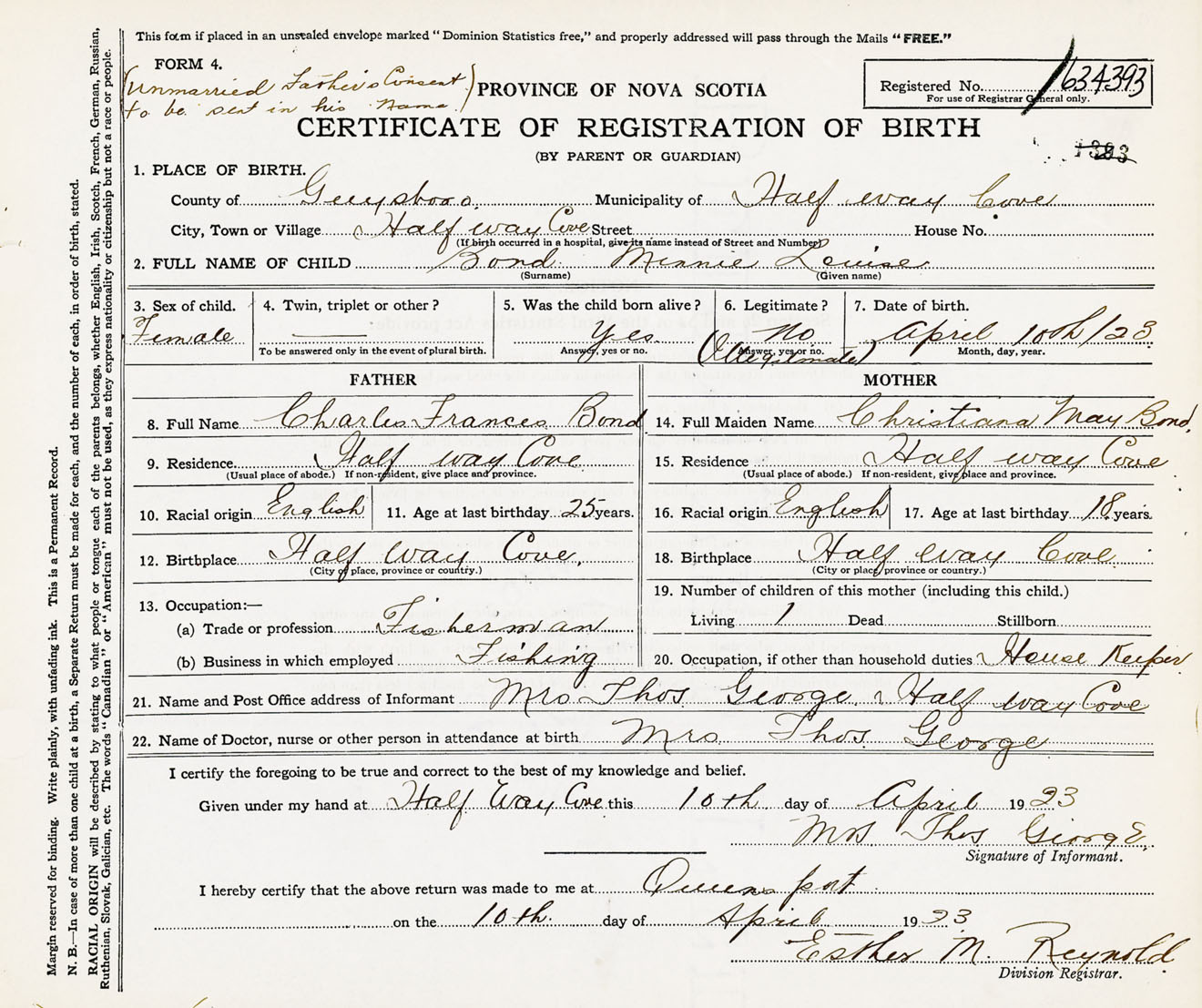 Female Birth Registration: Year: 1923 number: 63400393