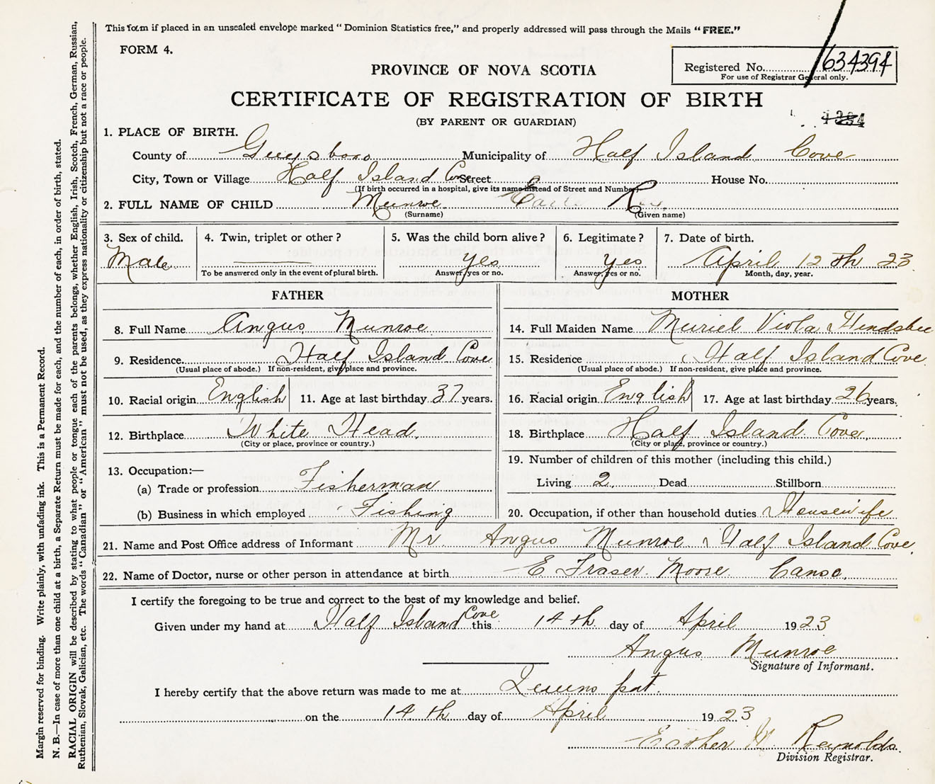 Male Birth Registration: Year: 1923 number: 63400394