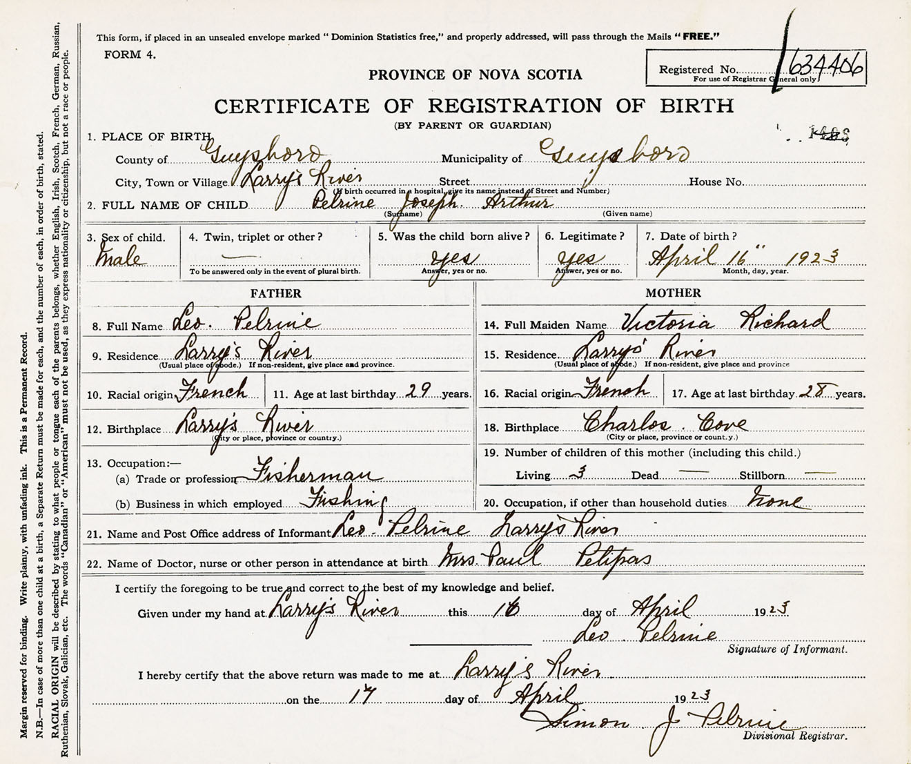 Male Birth Registration: Year: 1923 number: 63400406