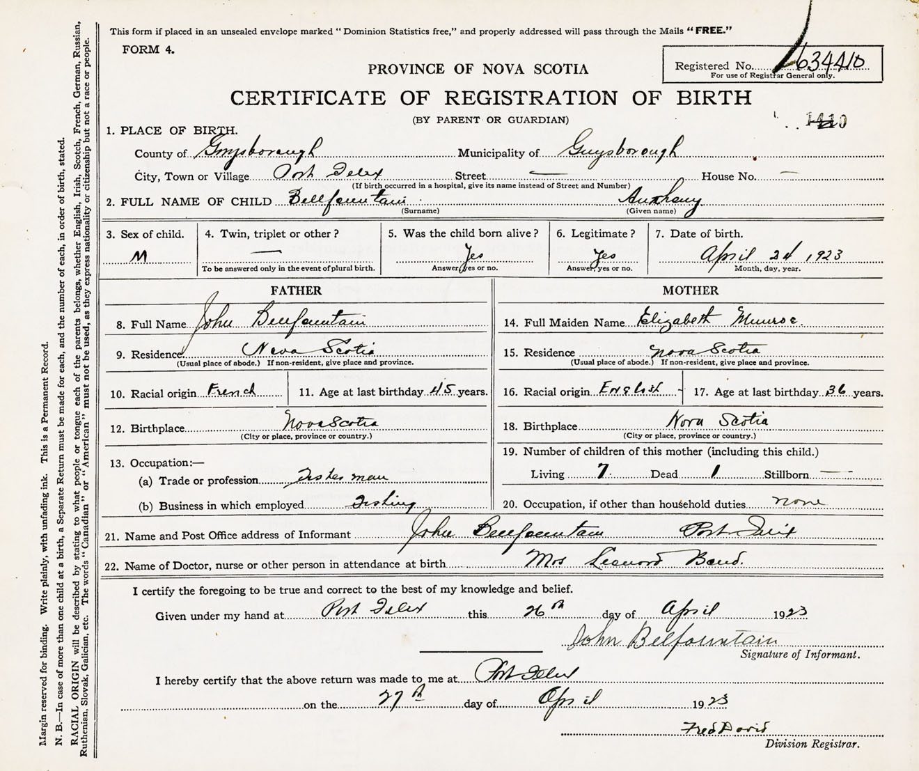 Male Birth Registration: Year: 1923 number: 63400410