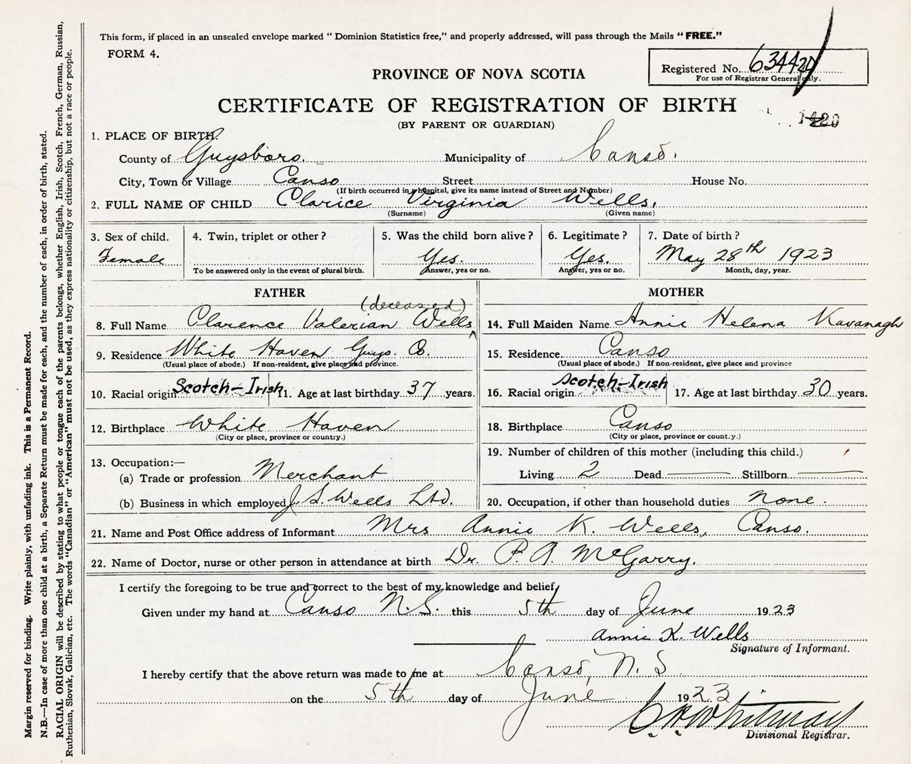 Female Birth Registration: Year: 1923 number: 63400420