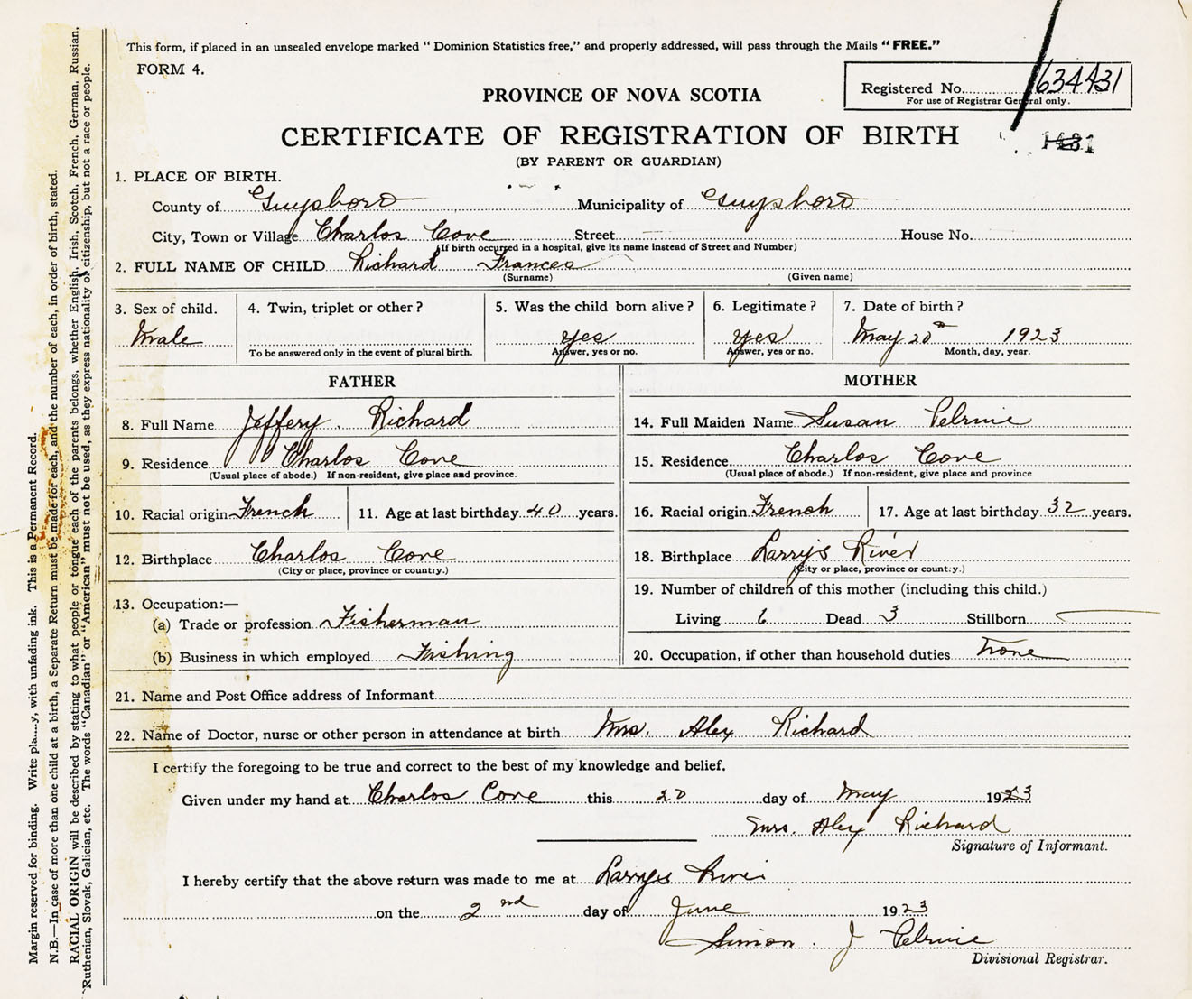Male Birth Registration: Year: 1923 number: 63400431
