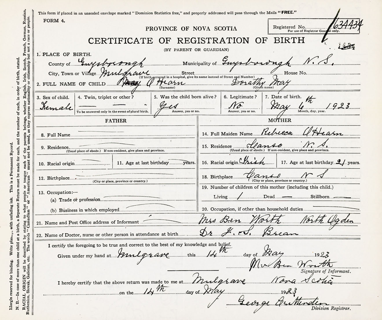 Female Birth Registration: Year: 1923 number: 63400434