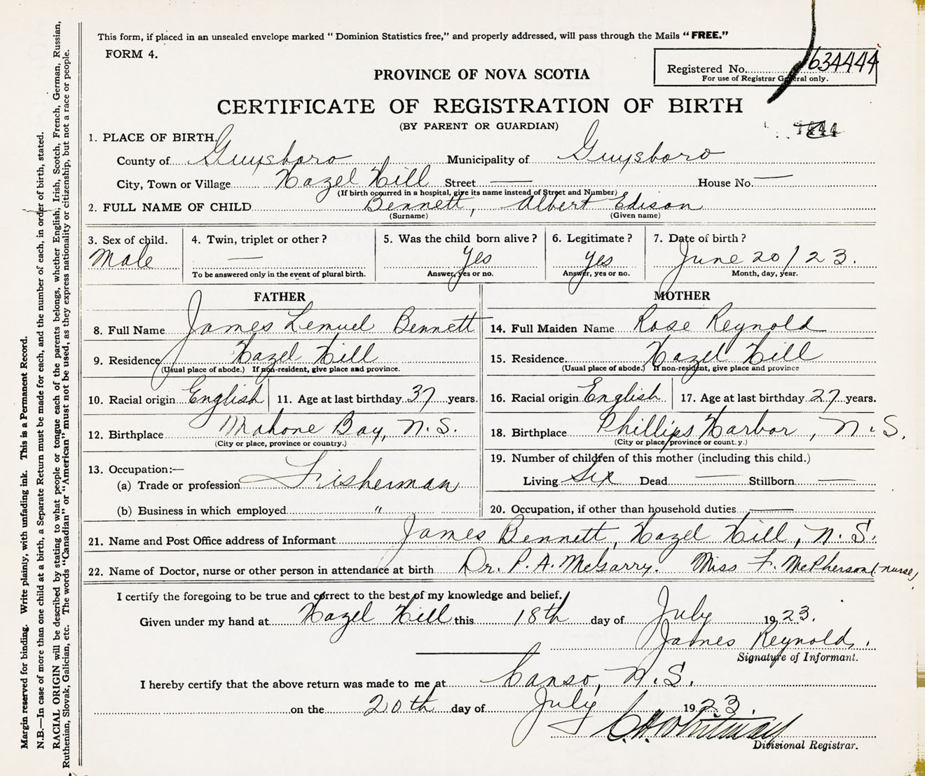 Male Birth Registration: Year: 1923 number: 63400444