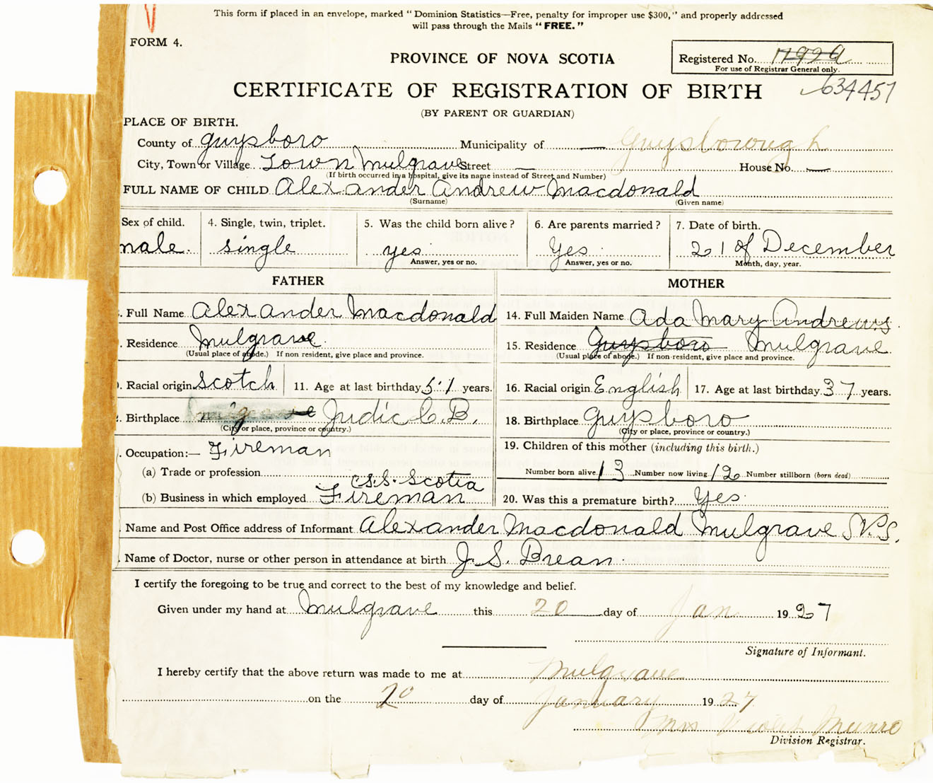 Male Birth Registration: Year: 1923 number: 63400457