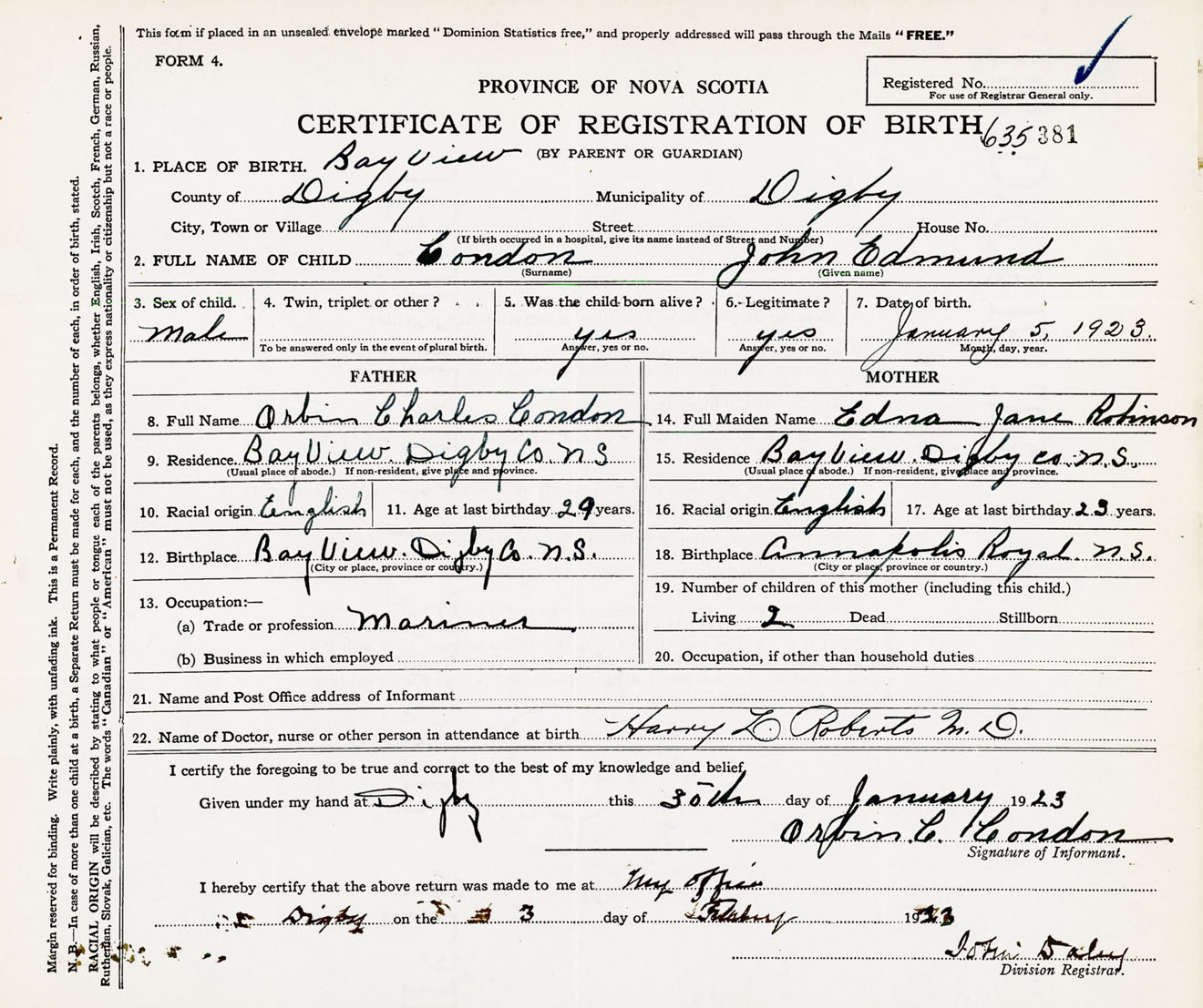 Male Birth Registration: Year: 1923 number: 63500381