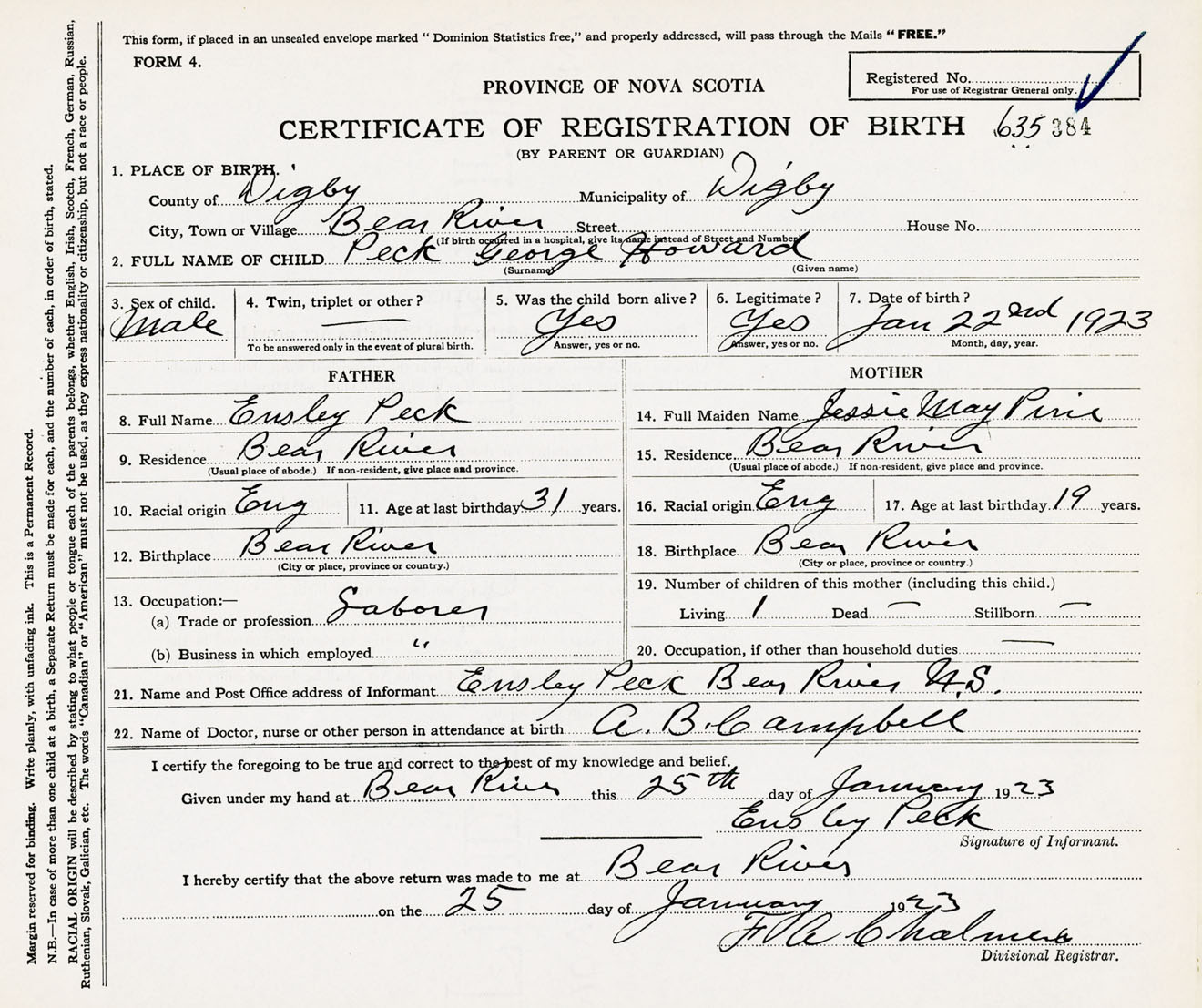 Male Birth Registration: Year: 1923 number: 63500384