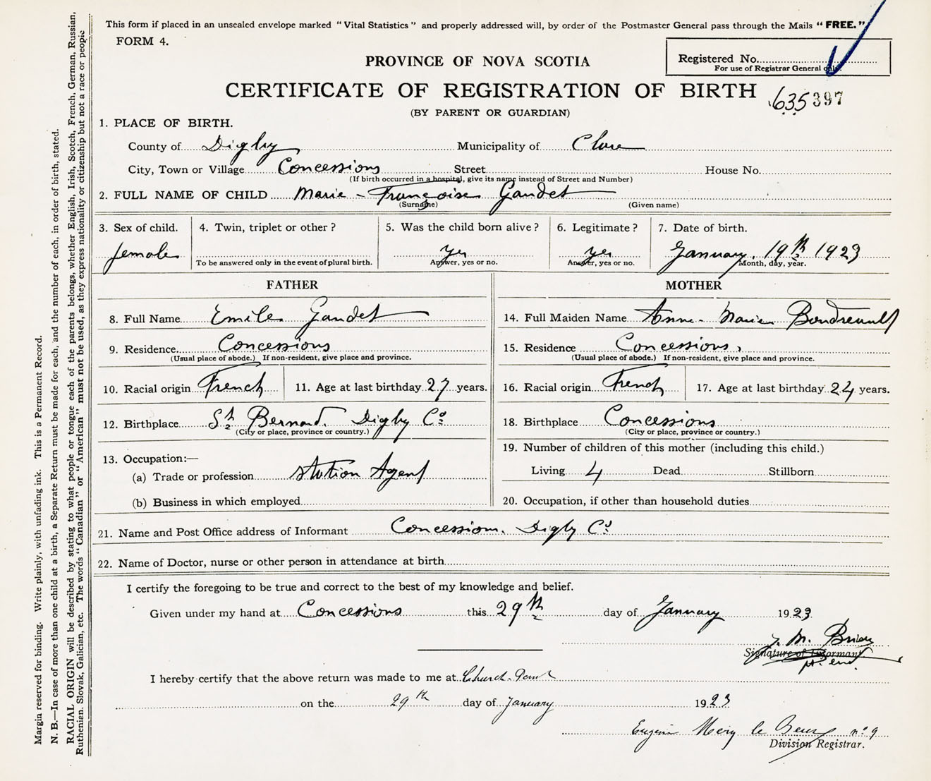 Female Birth Registration: Year: 1923 number: 63500397