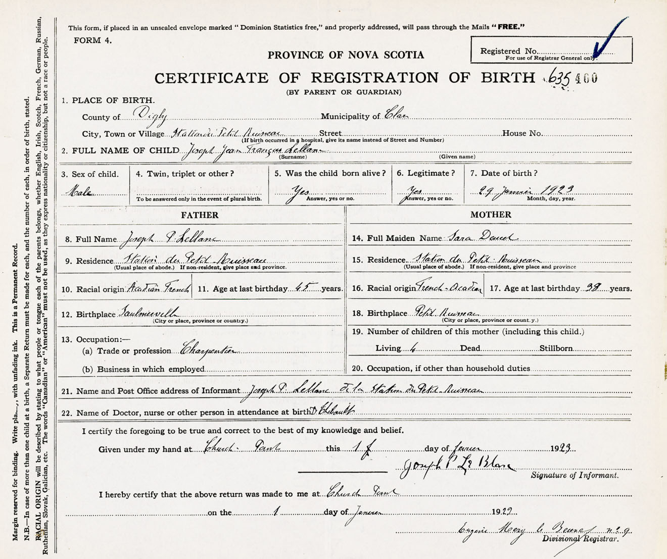 Male Birth Registration: Year: 1923 number: 63500400