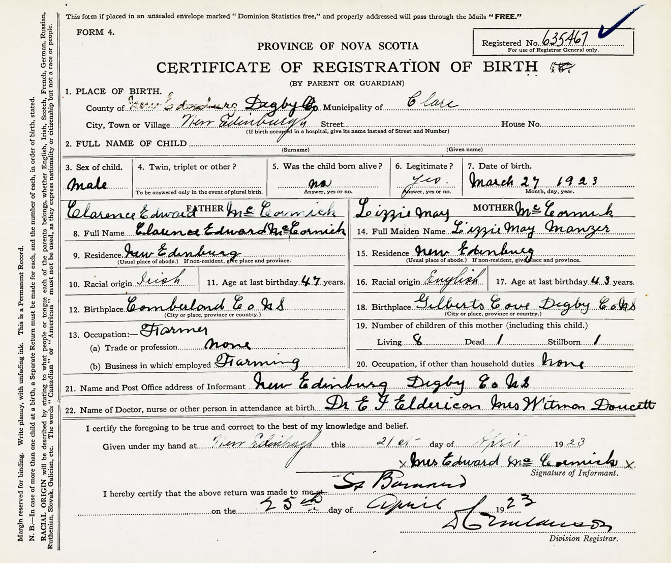Male Birth Registration: Year: 1923 number: 63500467