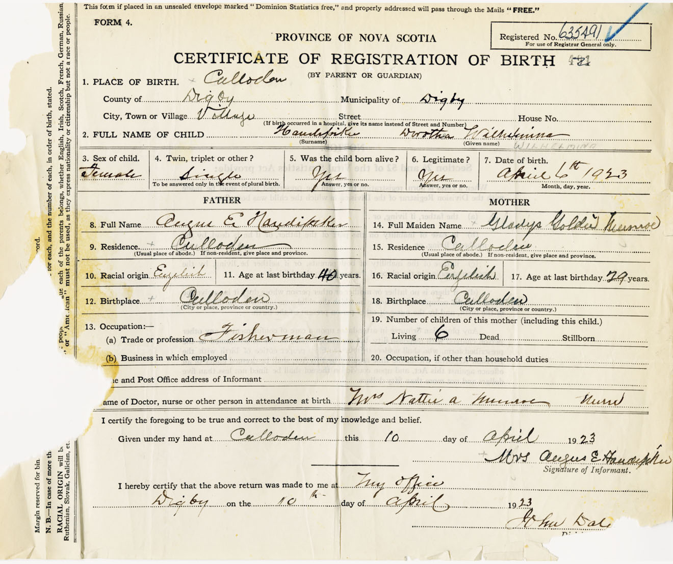 Female Birth Registration: Year: 1923 number: 63500491