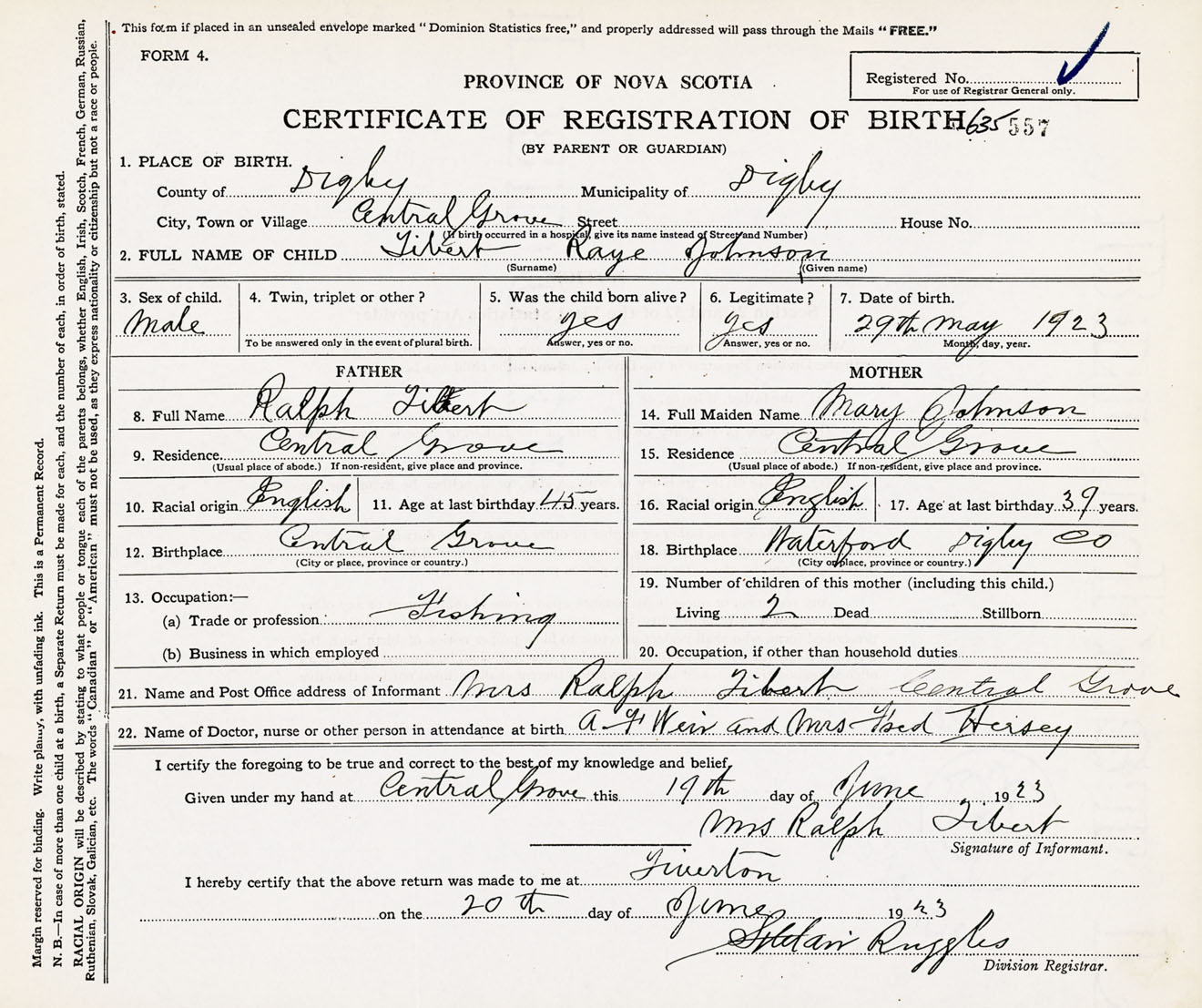Male Birth Registration: Year: 1923 number: 63500557