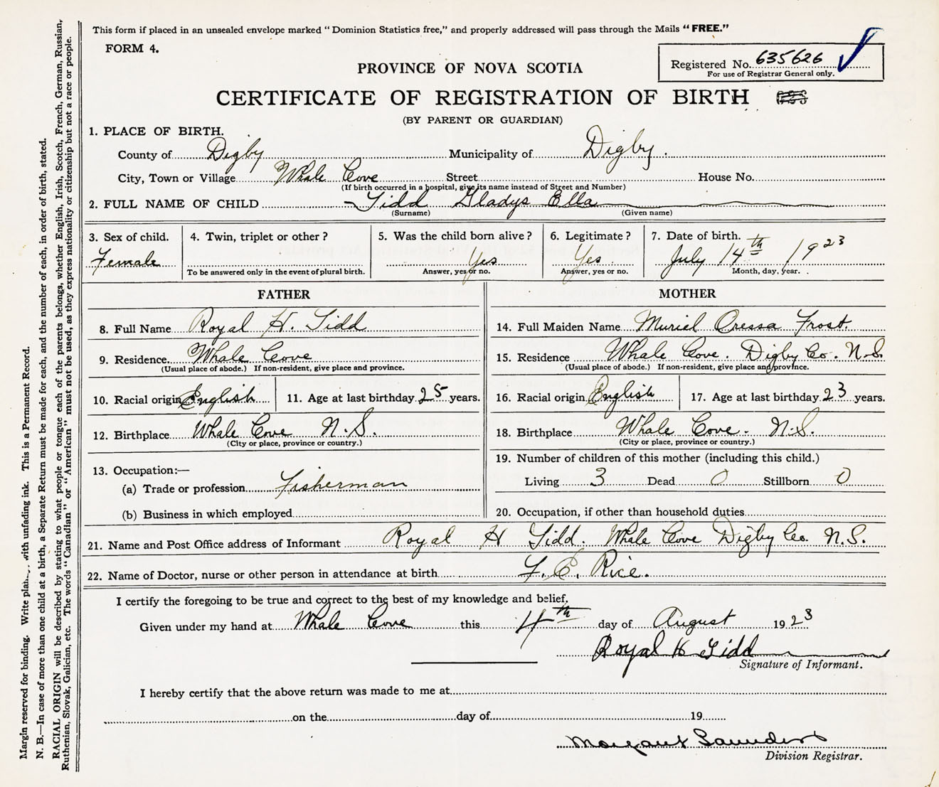 Female Birth Registration: Year: 1923 number: 63500626