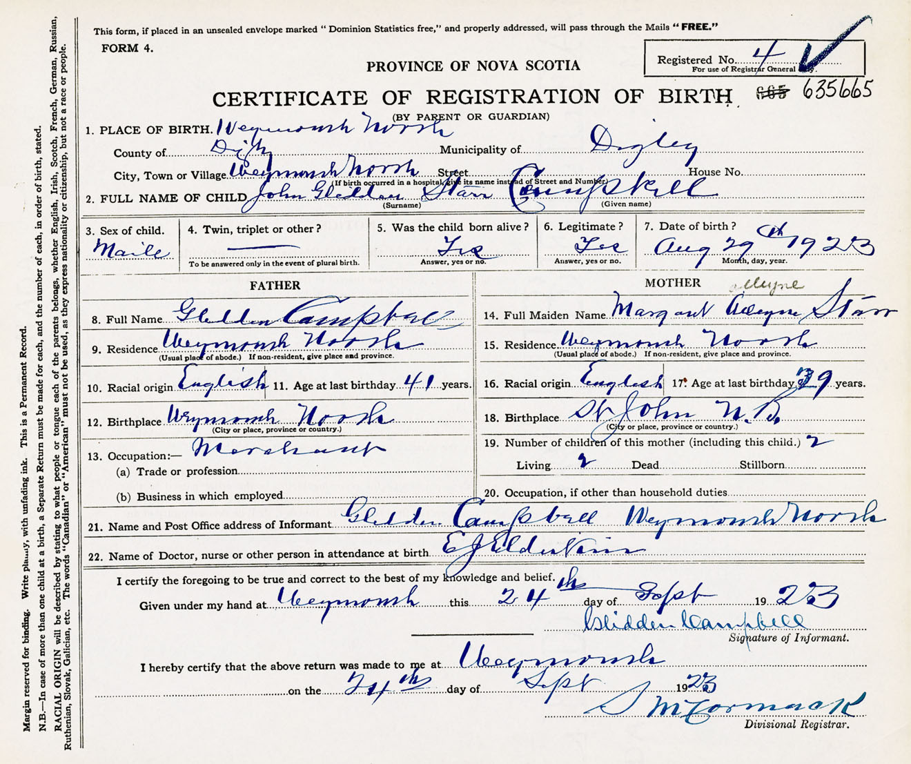 Male Birth Registration: Year: 1923 number: 63500665